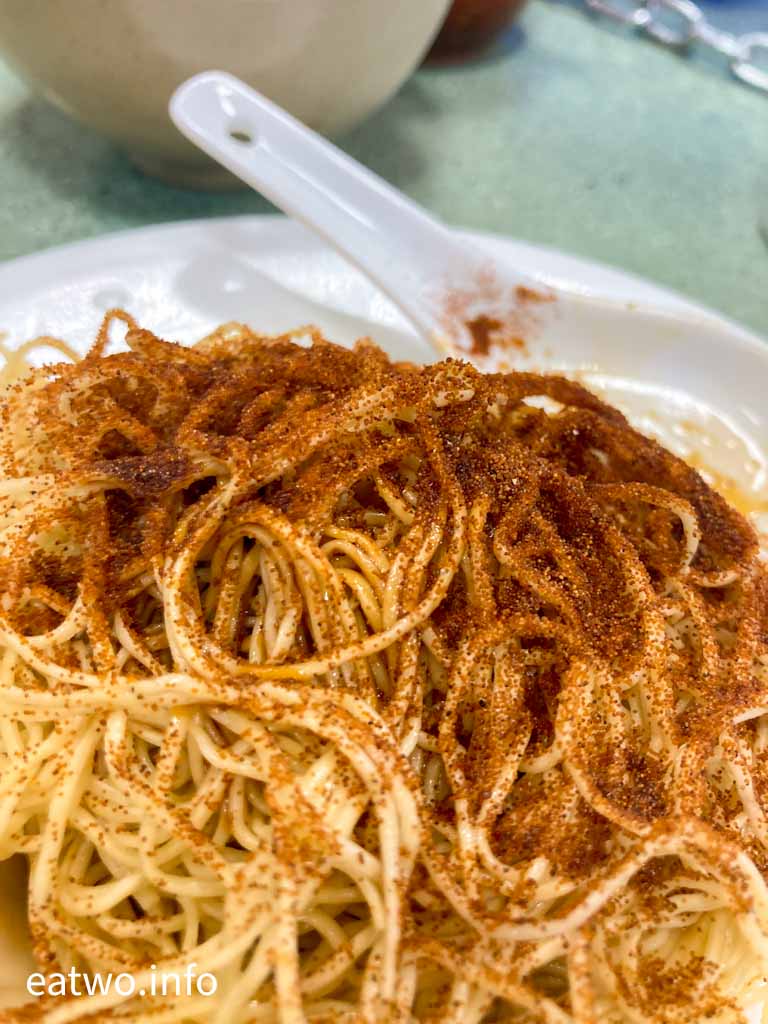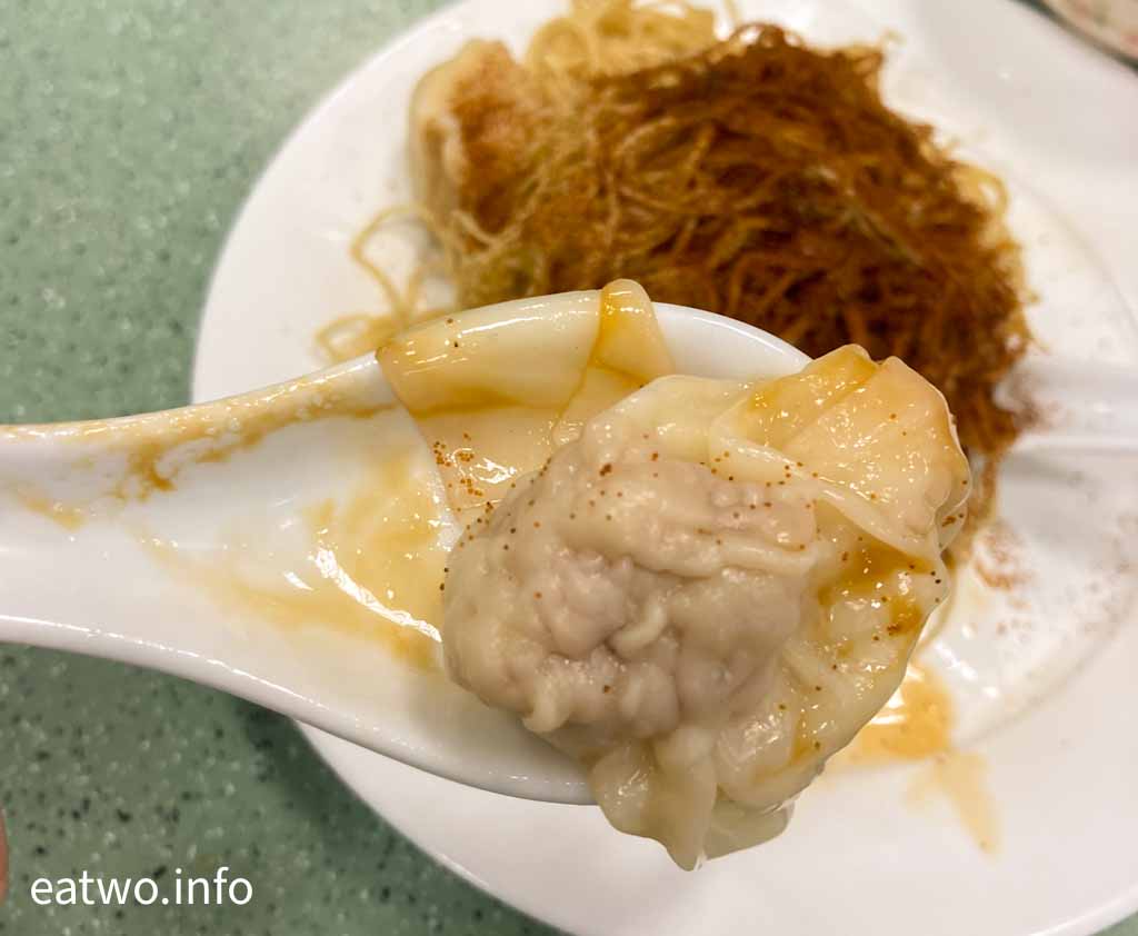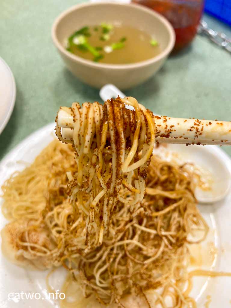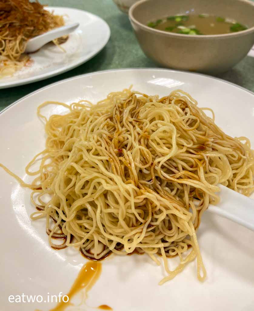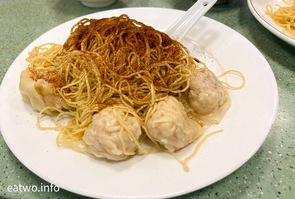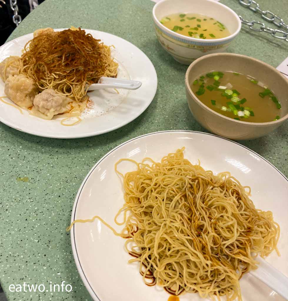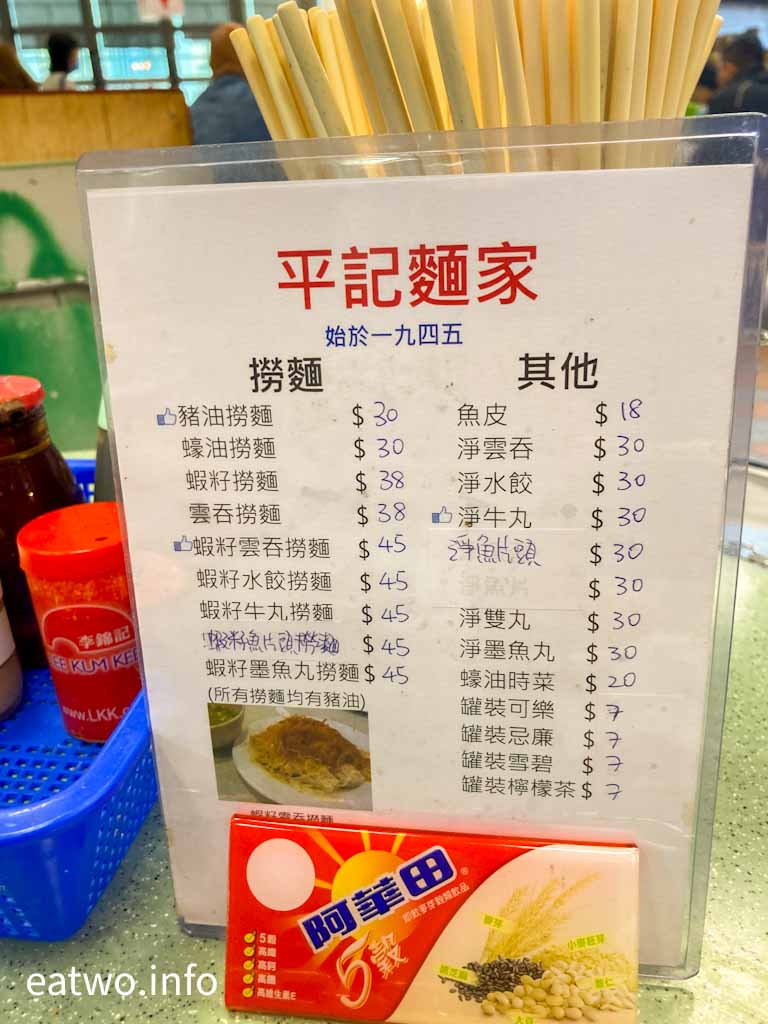 第一間係至今有逾76年歷史嘅平記麵家,最出名係上世紀「食家」蔡瀾先生大讚嘅豬油撈麵$30、「細蓉」雲吞麵,每一碗撈麵都配有清湯,但唔係大地魚湯。麵條為竹昇麵,豬油味唔重,但大排檔模式麵檔似乎幾十年無變過,感覺平靚正。至於蝦籽雲吞撈麵$45 同樣以竹昇麵炮製,麵條爽口彈牙,有煙韌感,唔會有好重鹼水味。蝦籽份量充足,每條麵條都黏有蝦籽,啖啖增添鹹香,再配以自製雲吞皮配上蝦肉、豬肉碎,的骰得嚟又感覺到新鮮,略嫌份量太少,豬肉餡比蝦肉稍多,而麵條只有寥寥幾箸,食完好似無食過咁。