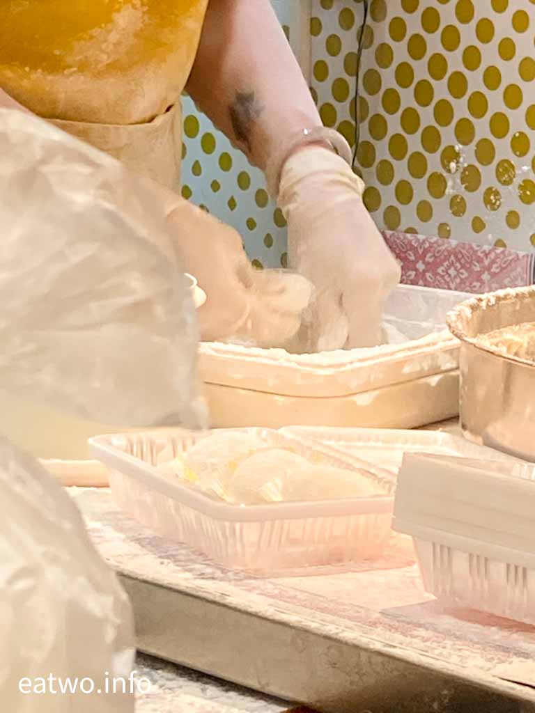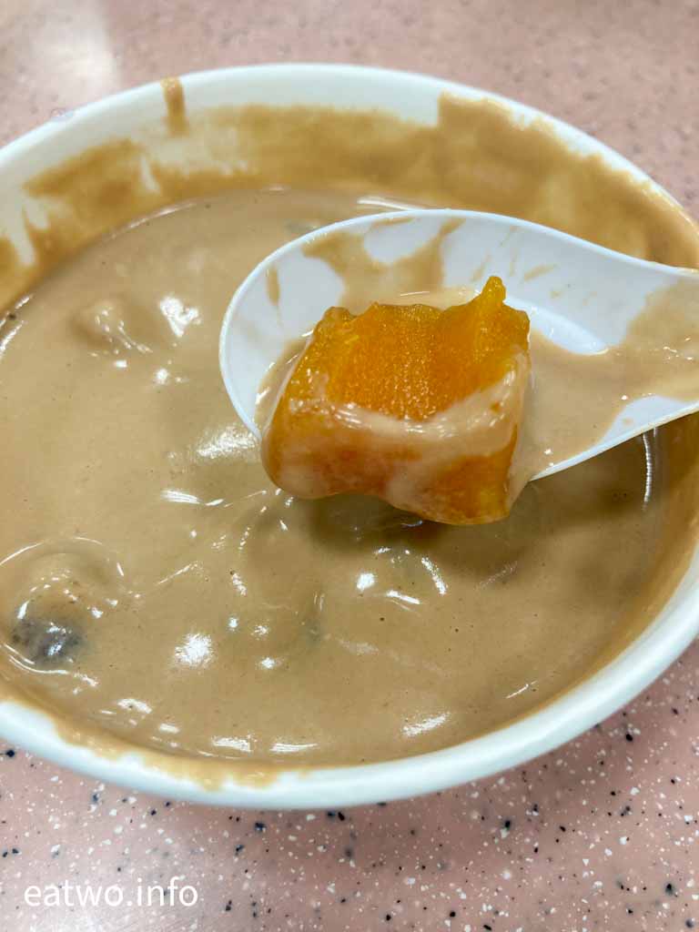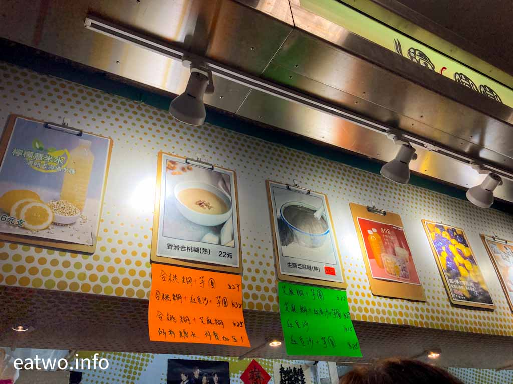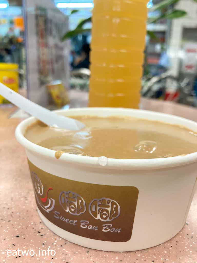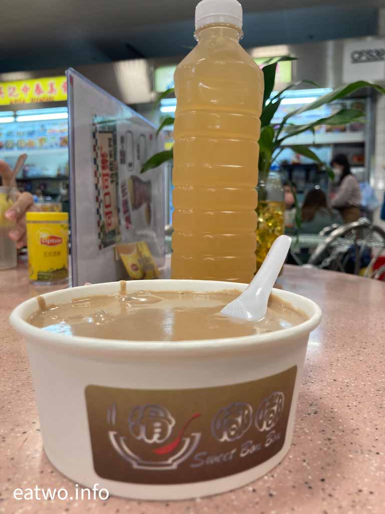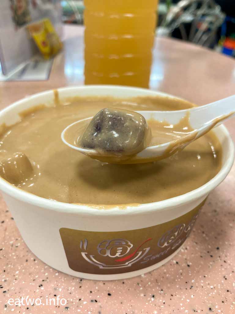 第三間係位處上述兩間背後嘅甜品店滑嘟嘟,店舖外不時有人排隊,而大多數人都係買客家糍粑$7、芝麻糊、合桃糊。客家糍粑尤如糯米糍,內含花生、芝麻餡料,即叫即包,員工摺完又摺,極快手包好一盒,係大埔名物之一。而芝麻糊比合桃糊平少少,兩者同樣為人氣之選,當中合桃糊配芋圓$27,合桃糊唔會太甜,有啖啖合桃香,混合糯米漿後質感軟滑細緻,順喉之餘亦齒頰留香,再配上煙韌口感嘅大粒三色芋圓,包含紫薯圓、蕃薯圓、芋圓,更有層次感,整體甜而不膩。而支裝飲品有自家製檸檬薏味水或雪梨茶$6,清甜解渴,甜度適中,適合食完甜品後飲用。