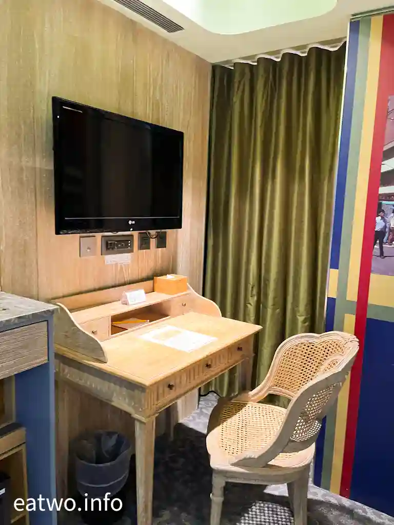 酒店於下晝4點先可以check in,而check out時間就係中午12點,入住後有2張房卡。酒店房間包含標準房、雙人房,客房連有獨立手間,浴室部份去水位不俗,唔會滲出外面。房間有基本設備,例如床、檯櫈、小型木衣櫃,大多係原木素材,床頭兩端均設有插頭。房間內亦有梳洗用品、風筒、茶包、咖啡、2支食水等。室內設計都係帶有復古感,尤其係銅件裝飾。不過,房間窗戶就無景觀可言,窗外只係對面樓。
