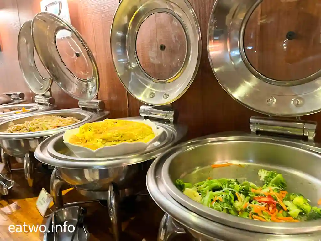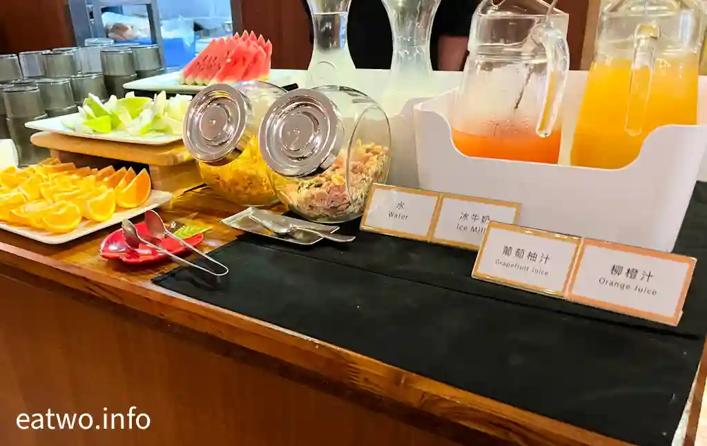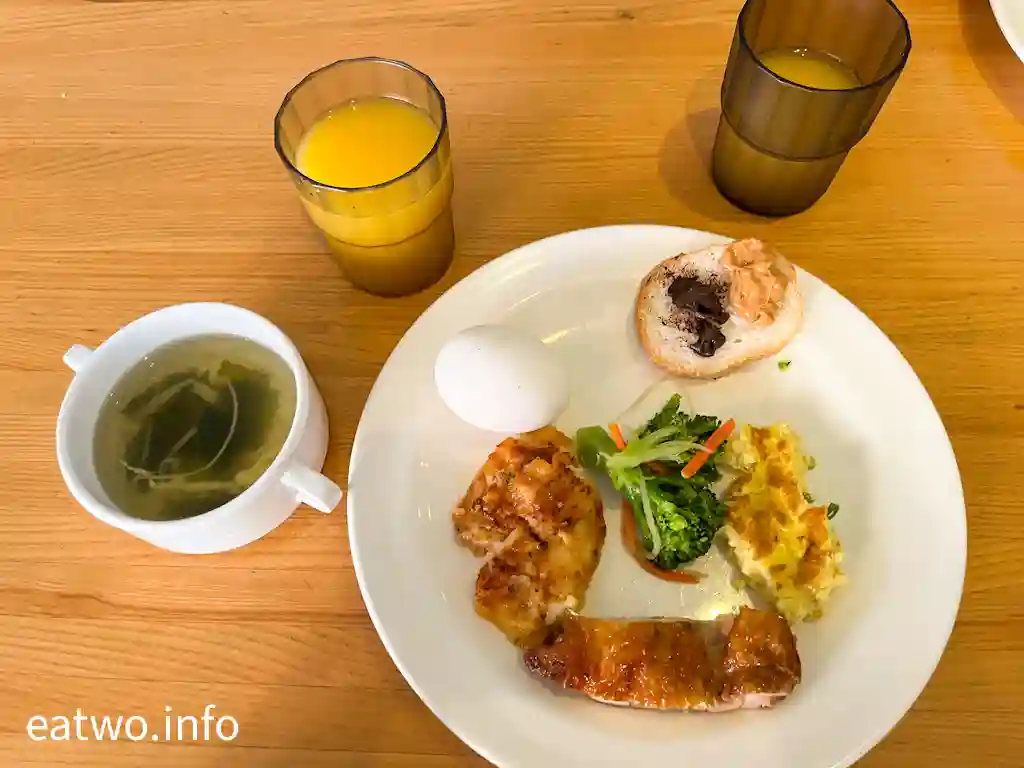 若挑選連早餐價,每朝可以到樓下食酒店早餐,基本上早餐時段由07:00至10:00。不過,朝早7至8點係最少人,而9至10點就最多人,屬尖峰時段,其實早啲起身既唔使同人逼,亦可以有更多行程。酒店早餐為自助模式,下行到2樓即達,可免費任飲茶水、果汁、咖啡、牛奶,而自助吧食物款式唔算多,包含有麵包類、湯、粥、飯、炒粉麵、水果,亦有2至3款菜式,以中式為主,少量為西式。基本上食物都係一早煮好,並無即製美食。不過,早餐時段補菜速度都頗快,好快refull返。