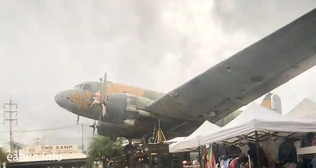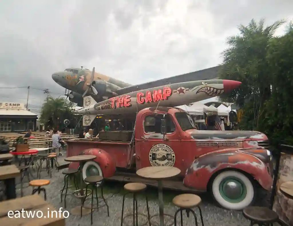 最特別之處,係攤販店舖都係以古董車、帳幕等設計,酒吧、美食區、咖啡館應有盡有,coffee and bar隨意任揀;跳蚤市場服裝店更有懷舊服飾、二手家品等售賣。此外,場內重有一架巨型飛機,打卡必到!