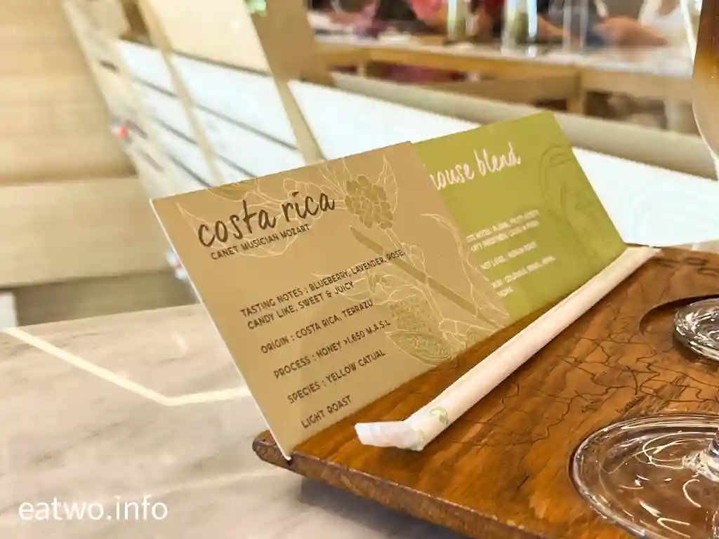 店內咖啡豆來自唔同國家,當咖啡沖泡完畢,自然會有通知,咖啡會擺放於小型木盤上,而每一杯咖啡背後都有一張小卡,介紹咖啡豆種類及來源,讓客人得知所點嘅咖啡由來,透明度高。比如當日實試嘅咖啡,內含costa rica及house blend嘅咖啡豆,同樣係果味重及帶有酸甜味,令咖啡不僅無苦澀味,而且原始味更濃。