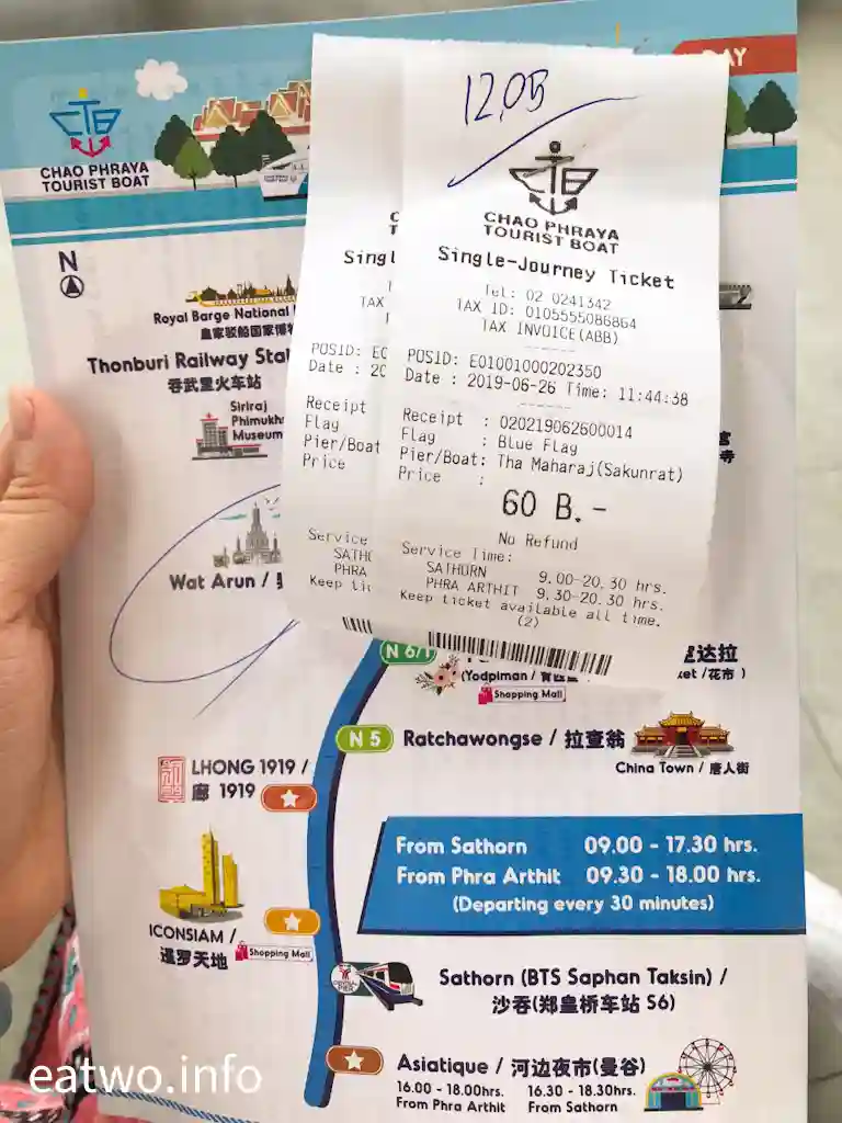 ❷ N9 Tha Maharaj 碼頭有「Chao Phraya Express Boat 藍旗觀光船」,藍色旗幟船隻可直達鄭王廟,一日票為150泰銖,單程則為40泰銖,約每半小時一班次,航線由09:30-16:00,船隻停泊碼頭Pier 1。碼頭距離曼谷大皇宮僅5分鐘步程。至於橙色旗幟則為交通船,停泊多個碼頭,每日由06:00航行至19:30,票價為15泰銖,班次密集,停泊於碼頭Pier 2。