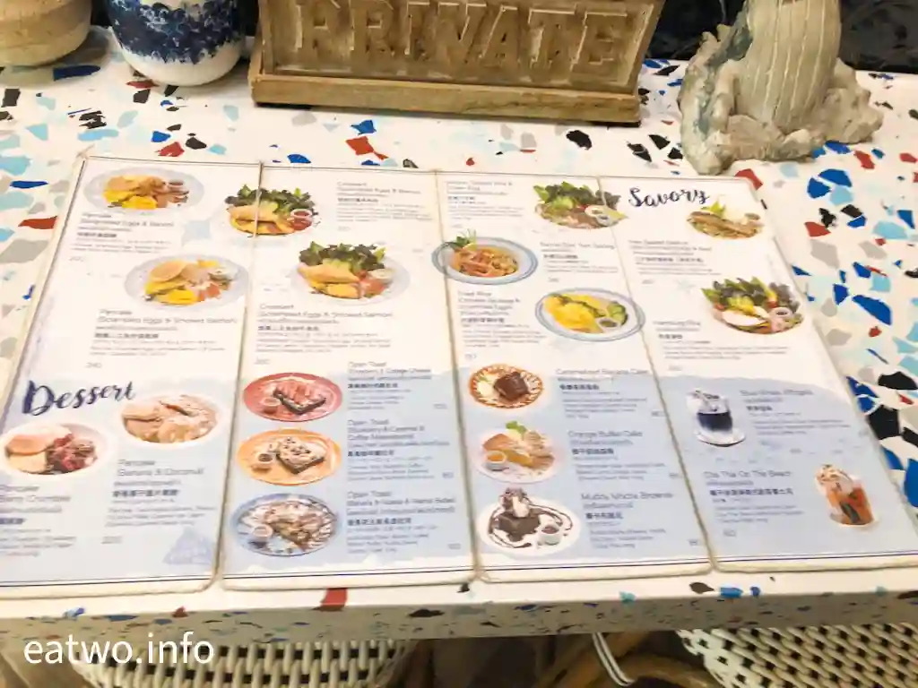 招牌之作必然係藍色咖啡,即係Iced Butterfly Pea Latte 120泰銖,為一杯被天然蝶豆花染成藍色嘅Latte,藍色與白色清晰地分成2層,攪勻後藍白交錯,與藍色裝修一樣令人感覺療癒,入口香甜,淡淡奶味逐漸滲出,層次均勻。另一杯為Iced Blue Whale Sour 120泰銖,則有如染上蝶豆花嘅lemonade,帶上酸甜,味道簡單。