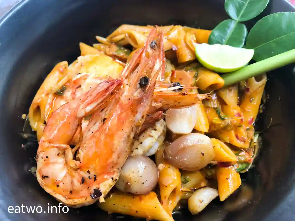 食物為正常發揮,無咩太大驚喜,比如係Penne Tom Yum Goong 280泰銖,即冬蔭功醬汁長通粉,份量唔多,只係上面有隻大蝦碌。而Open Toast with Blueberry and Caramel and Coffee Mascarpone 180泰銖,則為一份吐司,中間放有粒粒藍莓,同時淋上焦糖醬。