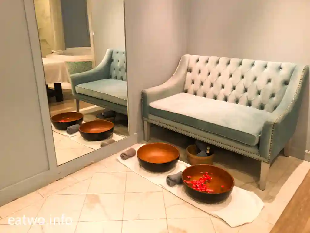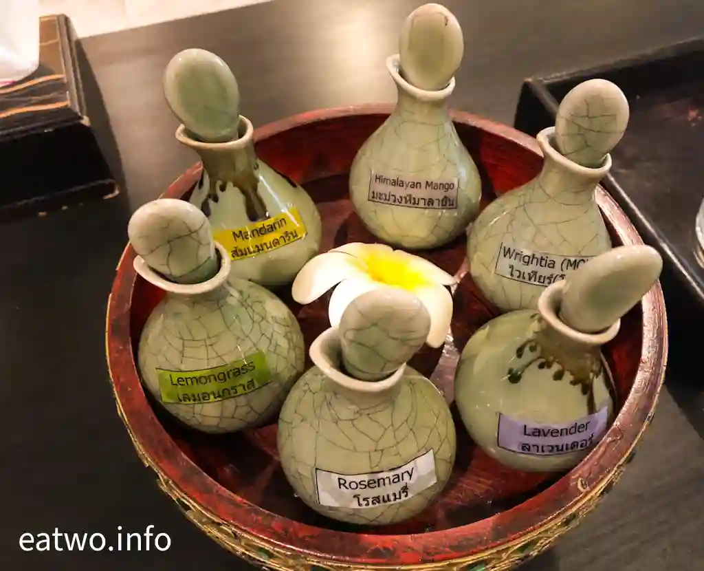 進入大廳接待處報到後,店員會遞上兩杯冰水,同時亦會遞上一盤香薰。整盤香薰包括有6款口味,讓客人自由選擇喜愛嘅香薰味道,當中有Lavender、Rosemary、Lemongrass、Wrightia、Mandarin、Himalayan Mango,即薰衣草、迷迭香、檸檬香茅、茉莉花、柑橘花、喜碼拉雅芒果。然後,技師亦會詢問有無邊個部位需要加強按摩。