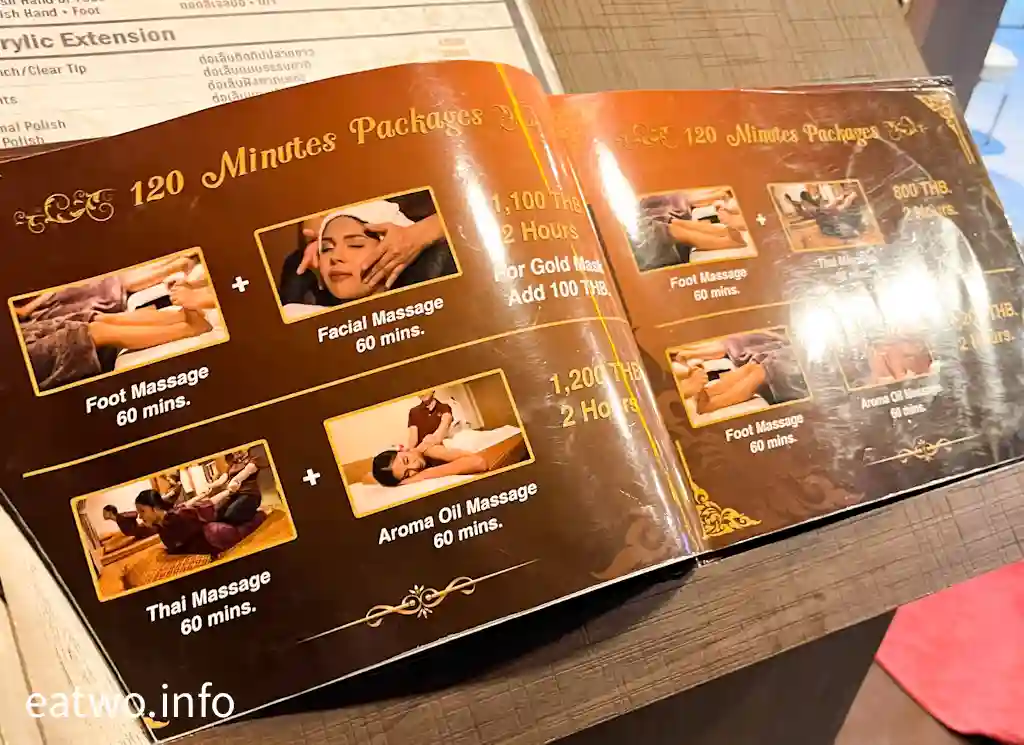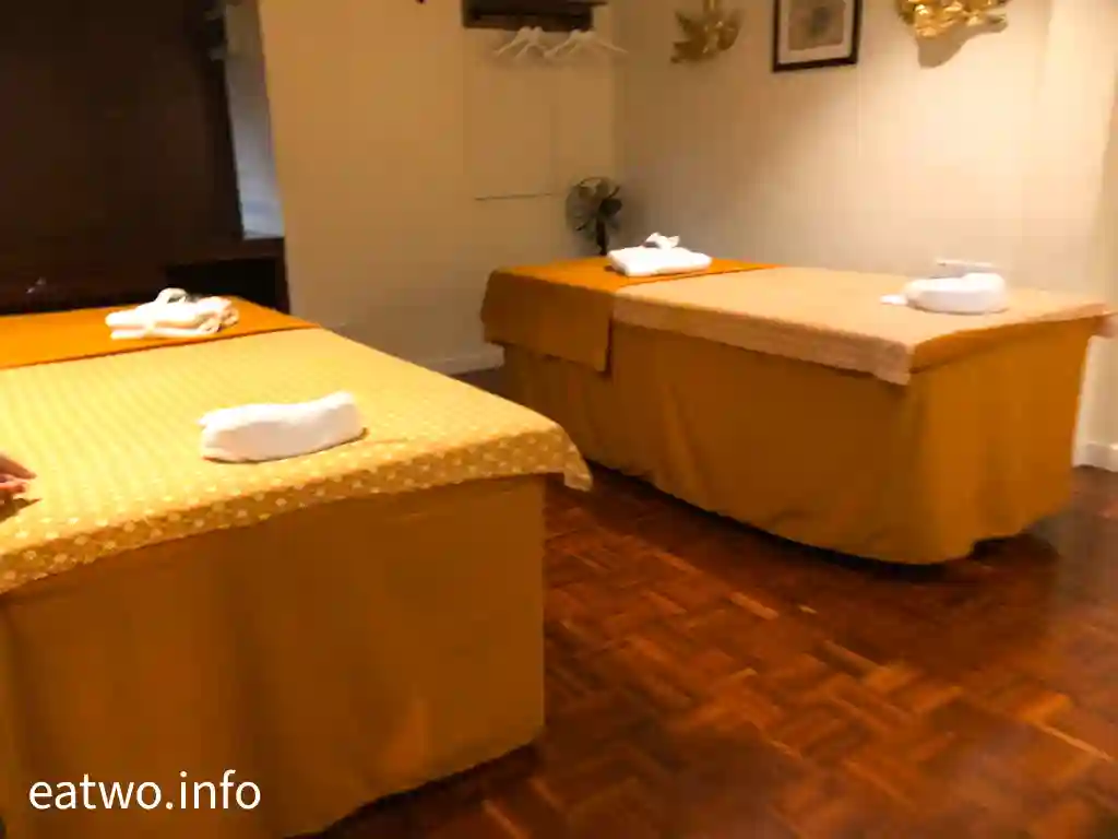 二、三、四樓都有唔同房間,可以選擇二人房或三人房,方便同認識嘅人同一間房做按摩。該店不時有優惠,例如朝早免費送30分鐘療程、二人同行又有special price。facial、按摩服務應有盡有,而肩頸按摩及腳底按摩就幾百泰銖就得,豐儉由人。而簡單100分鐘「Thai Treasure」為泰式按摩,同樣於獨立Spa房做按摩,則只係1500泰銖,折合港幣僅約375元。