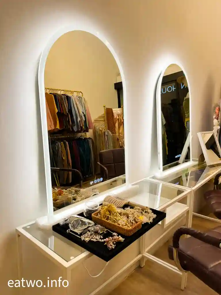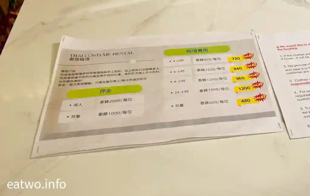 店舖分成兩邊,比較近大馬路嘅門口係主要接待處,內裏有客人等候區及售賣精品嘅地方,樓上則為房間。另一邊門口則有兩個用途,樓上係房間,而地下就係為客人拍攝泰服嘅地方,一端有唔同款式泰式可以選擇,更有化妝檯。成人每租借4小時需900泰銖,優惠價則為720泰銖,同時需要每位2000泰銖作按金。故此,「One More Thai」客人除咗可以做按摩等療程,亦可以有泰服體驗,店內可以直接租借泰服打卡!