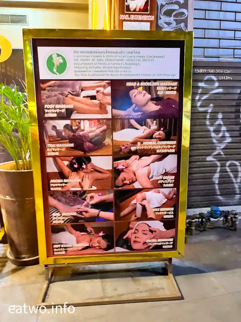 於曼谷擁有十幾間分店嘅「Lek Massage」,為當地連鎖按摩店,分店眾多,無論Siam Square、Asok、Thonglor,抑或Chong Nonsi、Sala Daeng等都有分店,而且位於BTS附近,交通便捷。最大優點係該按摩店營業至凌晨12點,對於鍾意旅行逛到好夜嘅朋友就係福音,按摩完直接返酒店就Perfect池!