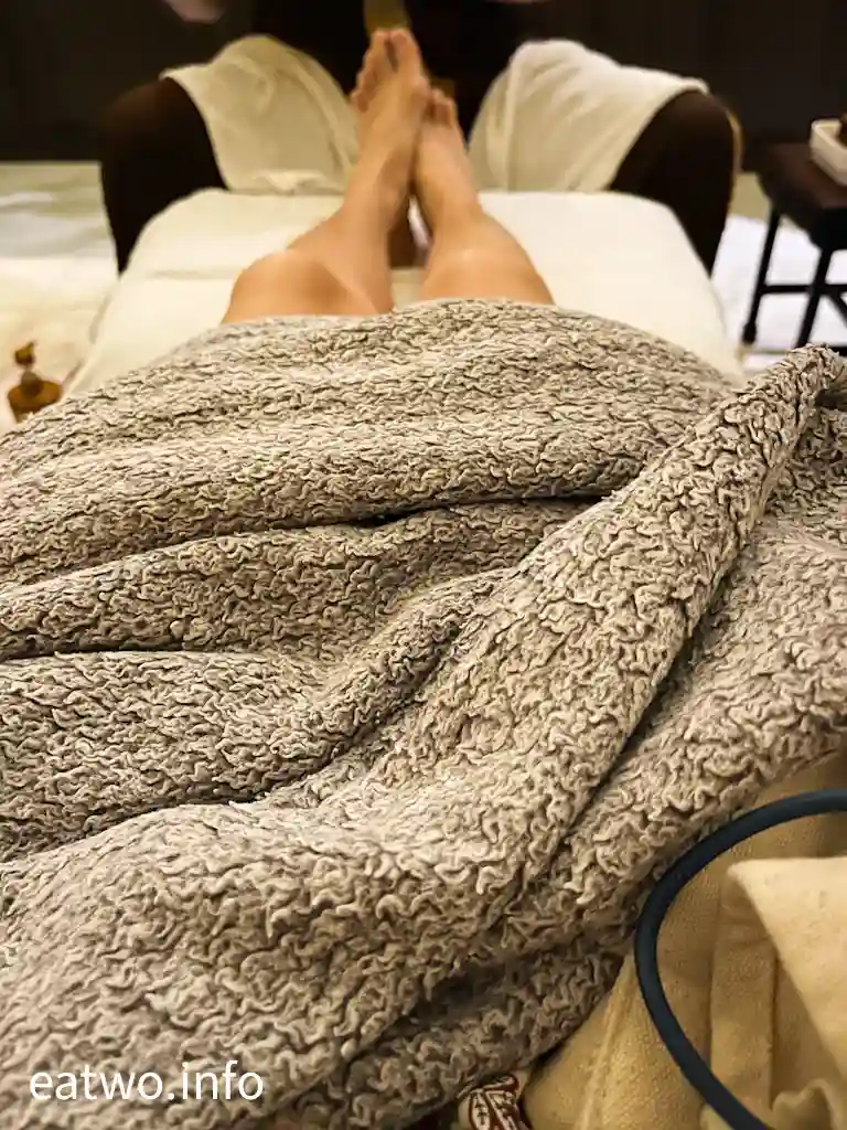 按摩療程同時包含雙腳按摩,以及草藥球、香薰按摩,大部份時間都係平躺按摩床上。技師手勢不俗,但時間分配唔太好,由腳按到身,再由身按到頭,足部按摩時間充足,夠晒放鬆。但上身至肩膊位似乎未夠舒緩,如果足部時間可以褪上上半身,多按穴位,可能會較好,不過整個按摩療程亦屬舒服,最後亦可以歎返份芒果糯米飯及熱茶。