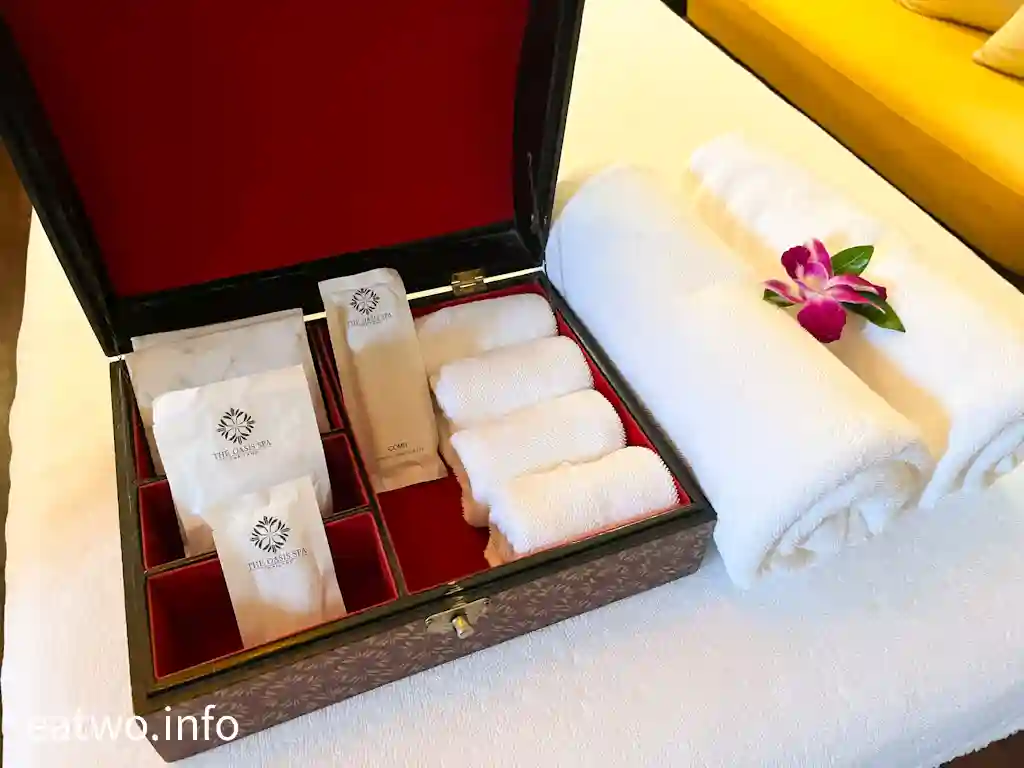 當日編輯挑選店內價格較高嘅「Warm Rose Package」,包含150分鐘療程,合共2.5小時,人均2890泰銖,折合港幣約722元。整個Package除咗60分鐘全身按摩﹐亦有身體磨砂,更有20分鐘草藥香薰蒸浴及20分鐘牛奶浸浴。另外,療程前會有一杯迎賓飲料及冰毛巾,飲品其實都係一杯泰式茶,而Package最後亦包括一份「Thai High Tea Refreshments & Relaxation」,完成後可以歎一份泰式層架鹹甜點,打卡必備!