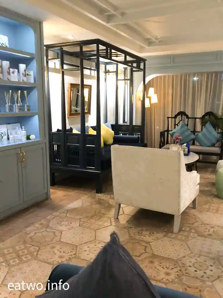 今次去「Treasure Spa」十幾年經驗,Siam分店內樓高4層,外觀上頗為霸氣。大樓以藍色為主調,室內地方偌大,裝潢時尚而有品味﹐進入按摩店時需要換上拖鞋。其中,第二層就係接待處,預訂booking之後直接拎出booking資料就得。