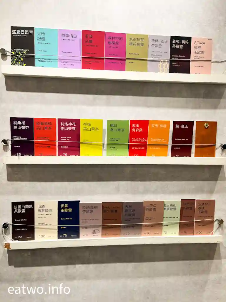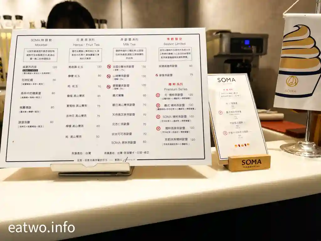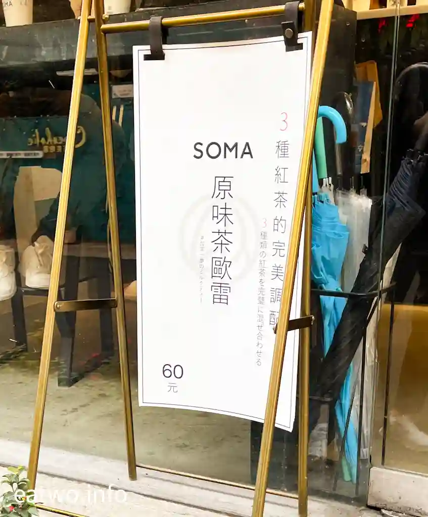 該店為「SOMA 特調飲品」,打造法式飲品,茶飲全以茶為基底,炮製特調飲品。店內有SOMA特調飲、花果茶、茶歐雷,亦有精焠、季節限定,價錢由TWD50至150不等。