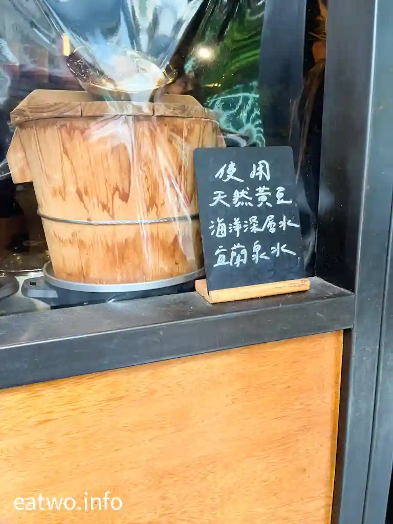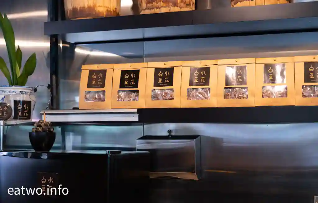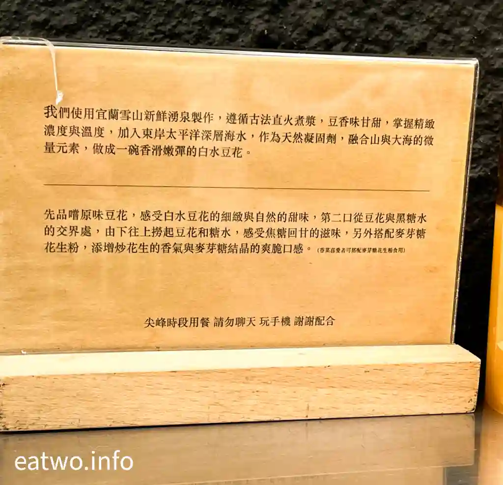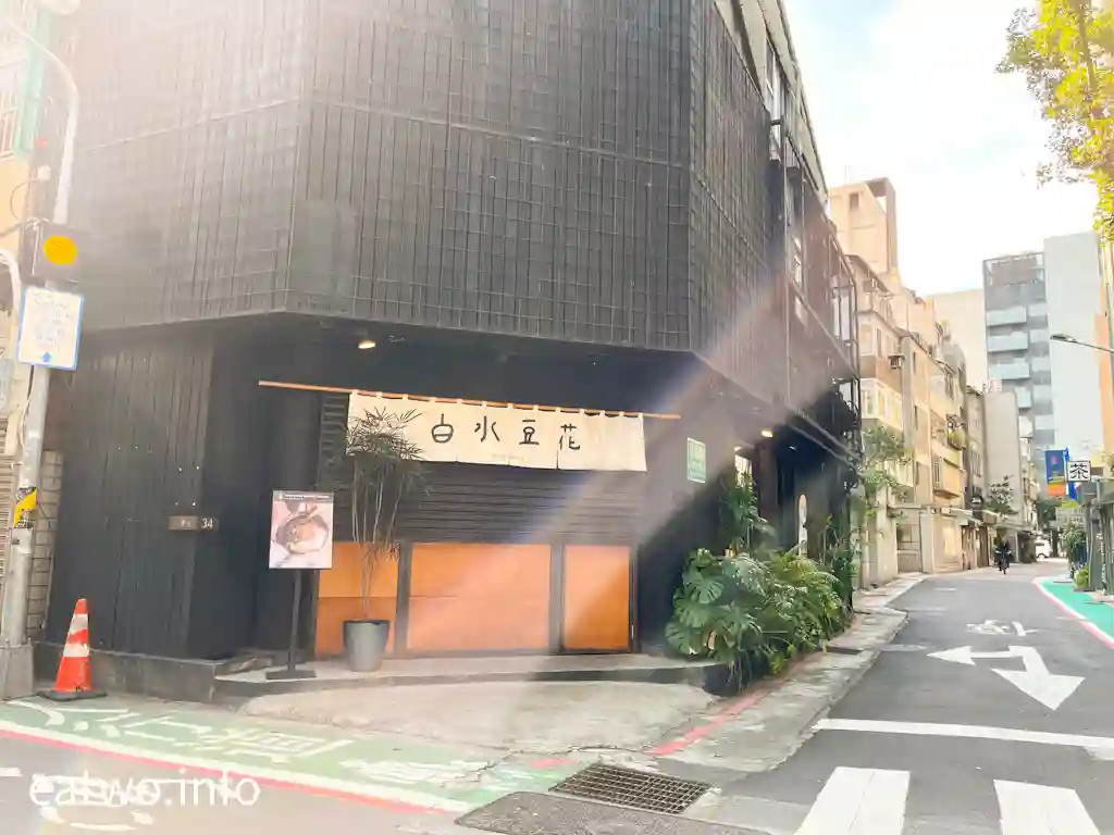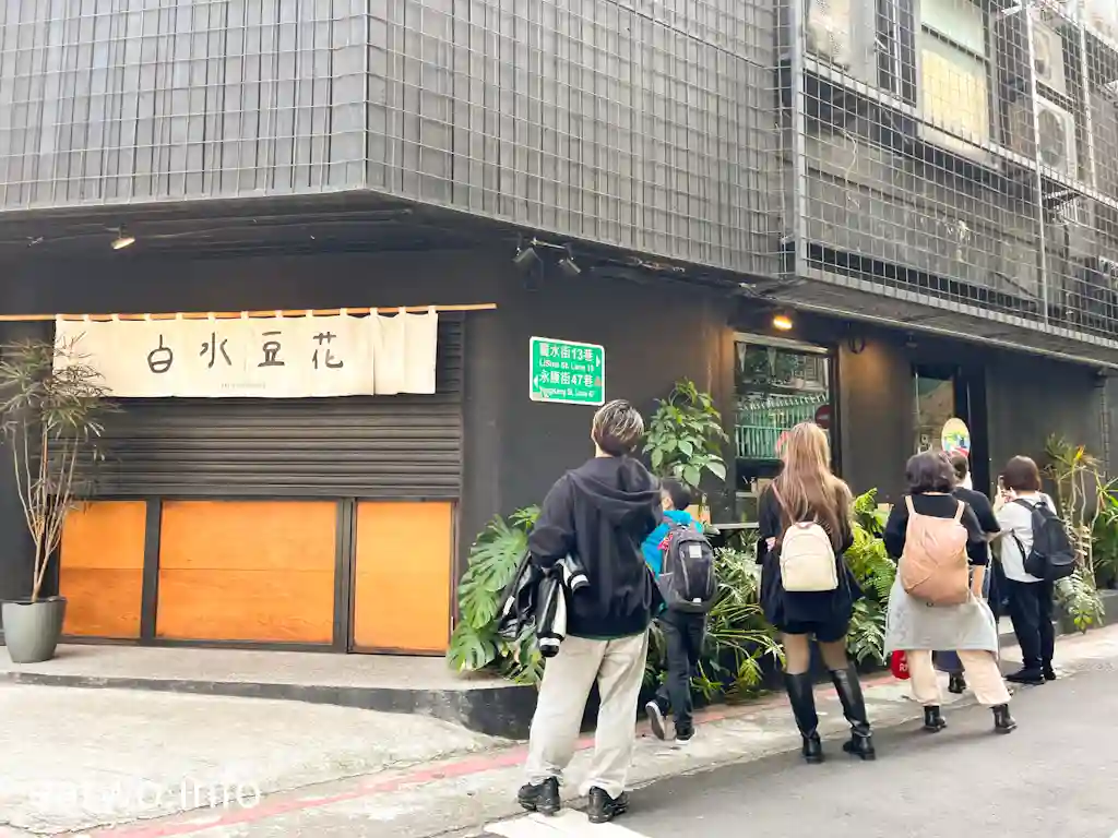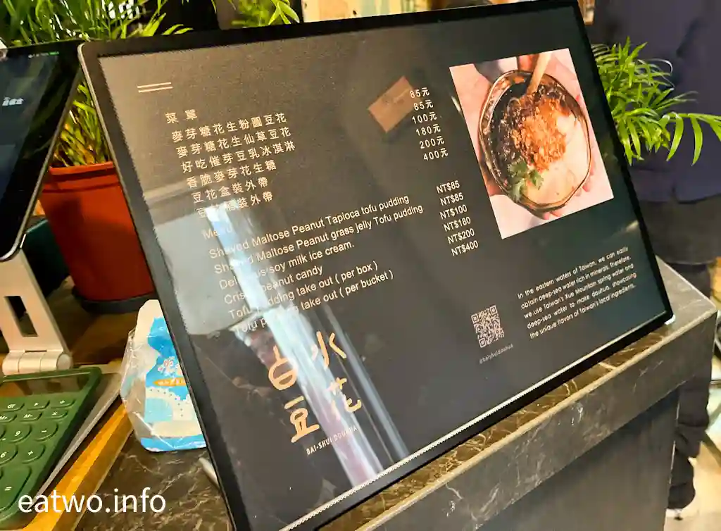 原先來自宜蘭礁溪嘅「白水豆花」,近年於台北永康街都有分店,靠近熱門景點台北101,交通更便捷。大門仍未打開,下晝1點半已經有少數人於門口等候,2點甫開門已陸續魚貫入內。店面寫明白水豆花係使用天然黃豆、海洋深層水、宜蘭泉水,裝潢亦貫徹以木材雕刻出水波形狀,感覺純淨而獨特。
