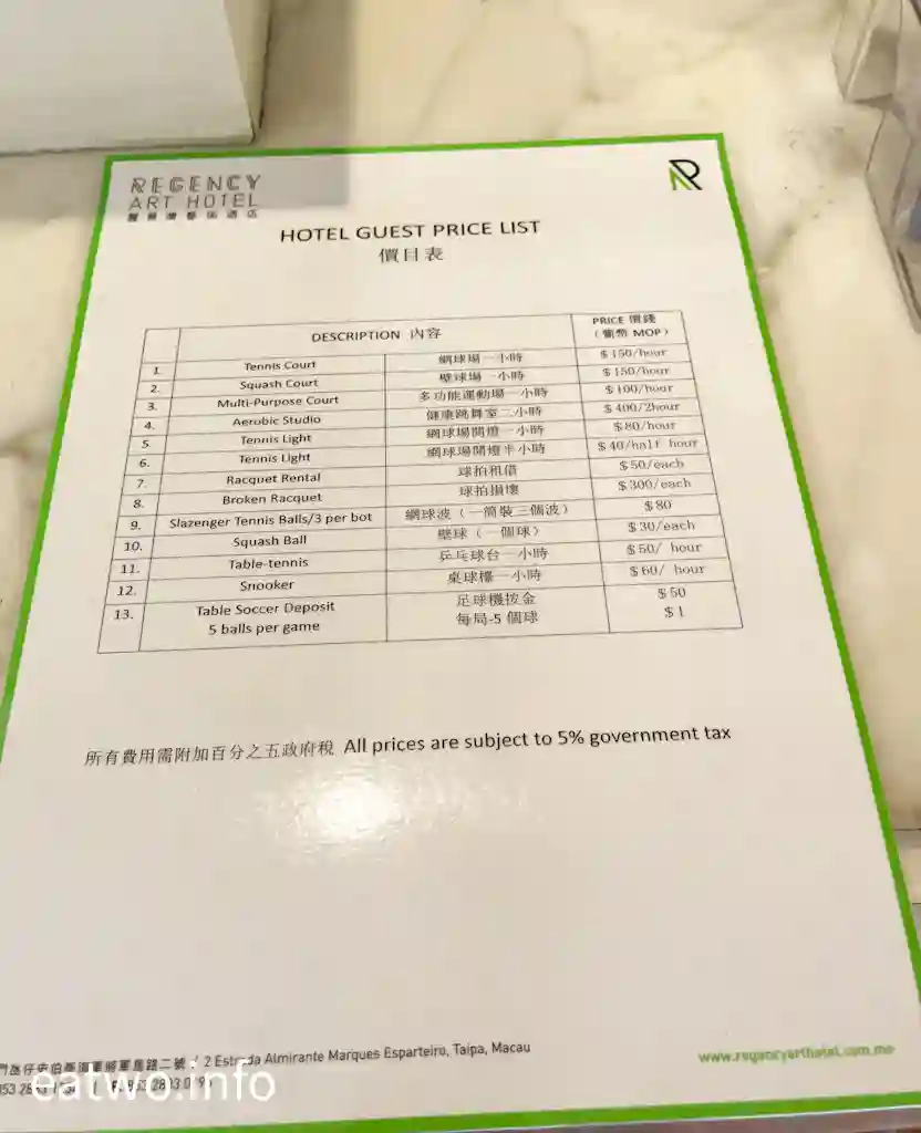 ❷ 酒店設施多設於2樓,而泳池則要轉電梯前往地下,或者行樓梯直達地下。泳池、健身中心、壁球場、網球場開放時間為08:00 - 20:00 ,而泳池開放日期為每年5至11月。
