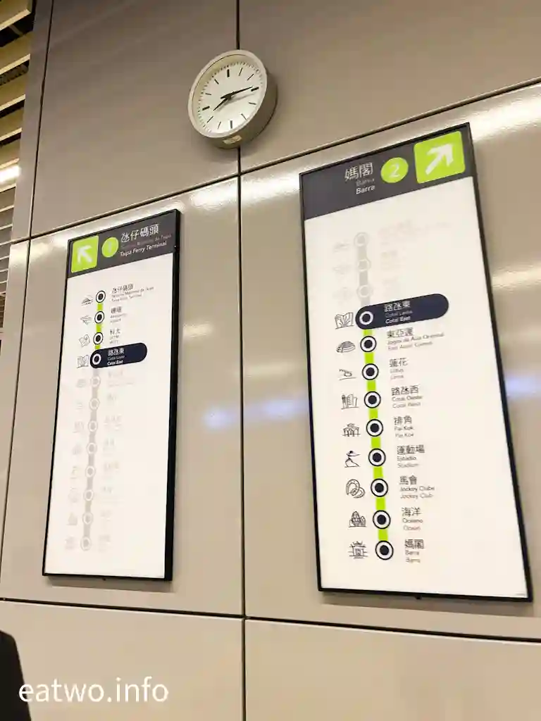 如果想跨海去澳門半島方向,需要去「媽閣站」;「媽閣站」附近有媽閣廟、海事博物館、聖雅各伯小堂、媽閣炮台;而「氹仔碼頭站」可直達氹仔客運碼頭;另有「機場站」可以去到澳門國際機場。如果想去官也街或澳門銀河一帶,可以前往「排角站」;若然想去威尼斯人、巴黎人等賭場群,可以搭去「路氹西站」;如果想去倫敦人、美獅美高梅、新濠天地、永利皇宮等,則要前往「路氹東站」;而若去新濠影匯、氹仔馬場,則要去「蓮花口岸站」、「馬會站」。澳門輕軌每班次大概要等候10分鐘,而車程就同平常曼谷MRT或香港鐵路時間相近,都係2分鐘左右車程,唯獨跨海段則需要4分鐘。
