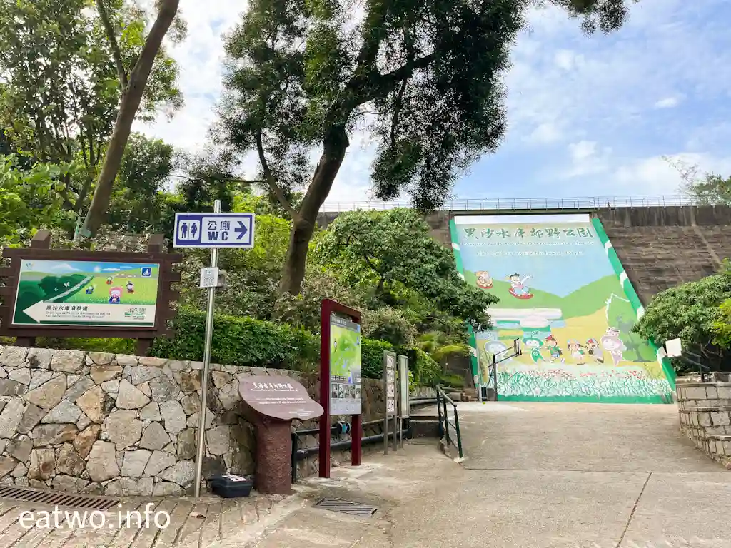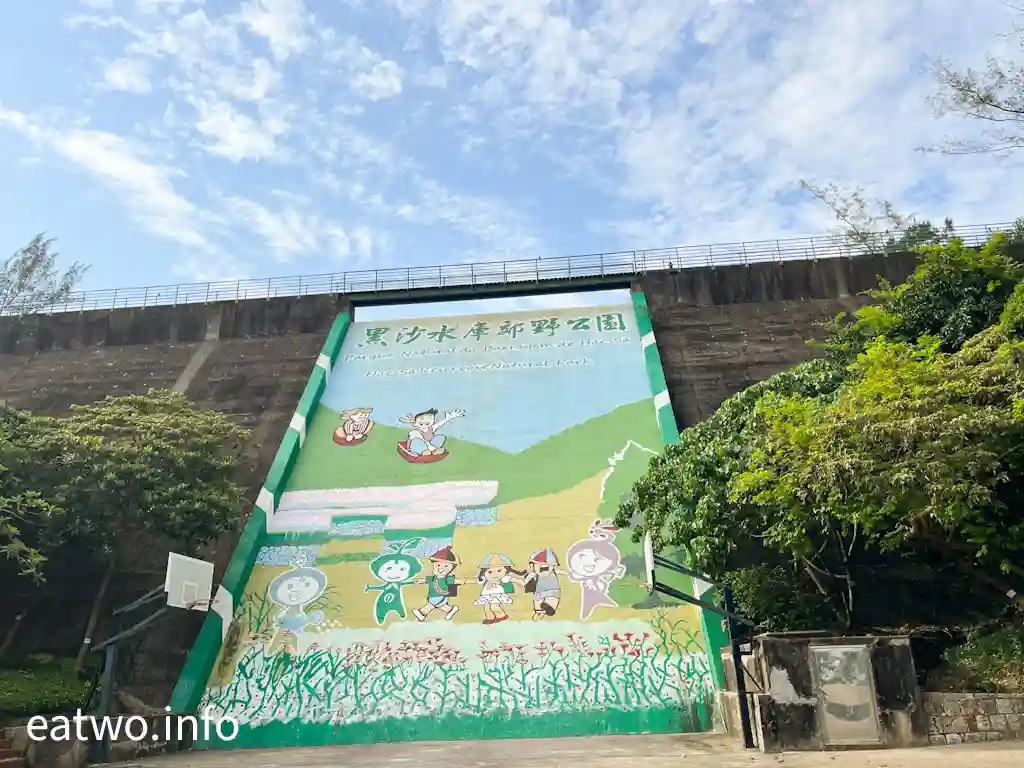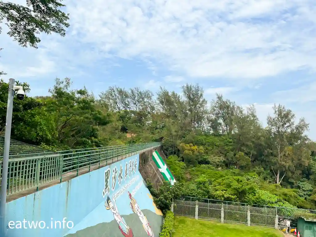 既然水上樂園暫不開放,唯有先逛逛其他部份,「黑沙水庫郊野公園」本身其實係一個燒烤公園,源自於1993年。從入口上行斜路,即馬到達燒烤場範圍,而燒烤場上方正正係「黑沙水庫」水壩同吊橋。水庫牆壁被髹上壁畫,上面寫有「黑沙水庫郊野公園」八個大字。