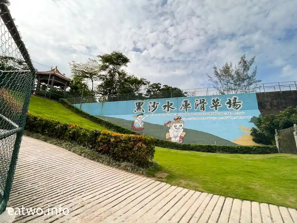 「黑沙水庫郊野公園」有行山路線「黑沙水庫家樂徑」,亦有一個兒童滑草場。原來所謂嘅滑草場,只係一個小小山坡,被修整成滑順綠草斜坡,然後變成一個能夠俾小朋友玩樂嘅地方,認真有創意!