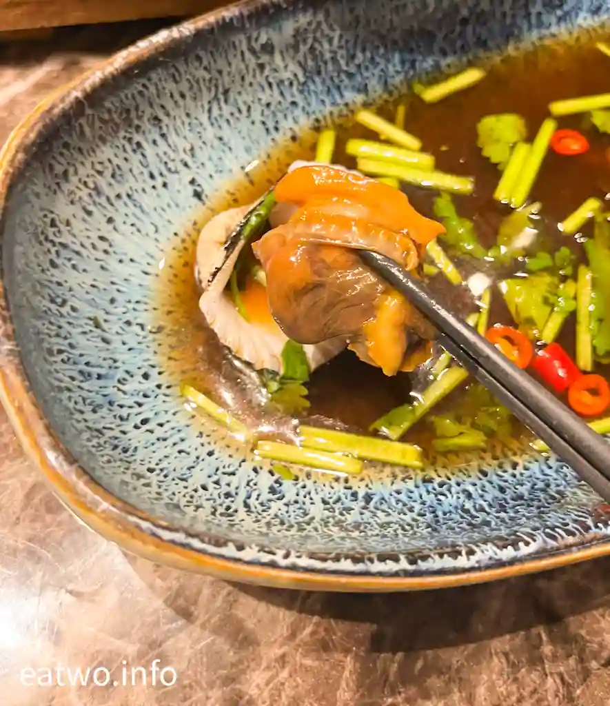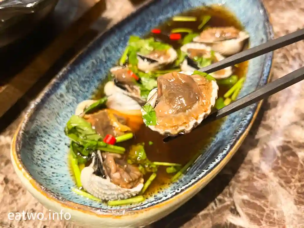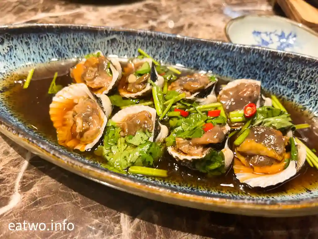 原來「天潮」意指既係「潮流」,亦係「潮州菜館」,主打係潮州菜,以及新式菜式,感覺似私房菜。簡單嚟講,即係潮州打冷,例如凍蟹、滷水小食,每碟由MOP98起。前菜有小碟涼菜,亦可自選茗茶。實試咗一款天潮醃螄蚶MOP98,頗有驚喜,螄蚶每隻都頗大隻,入口爽脆滑嫩,配搭調配過嘅醬汁特別出色,內有蔥、辣椒、芫荽,重有蒜香、醋香,略有微辣,混合起嚟好配合螄蚶。