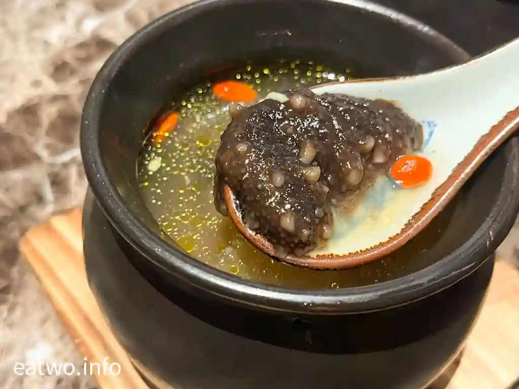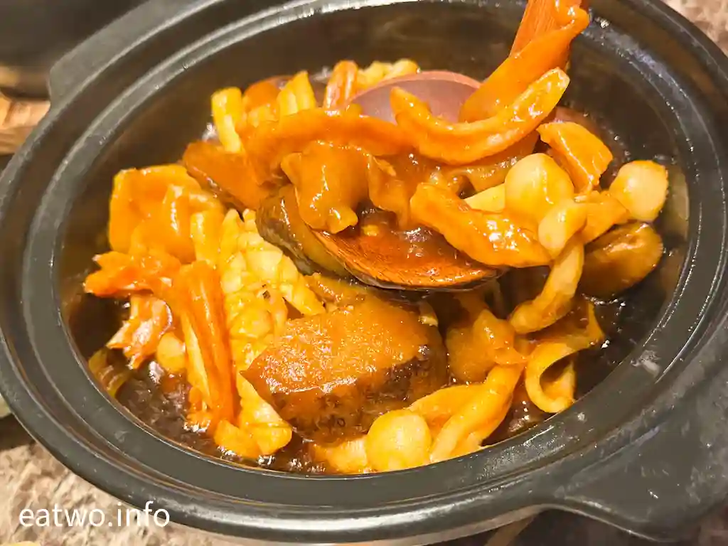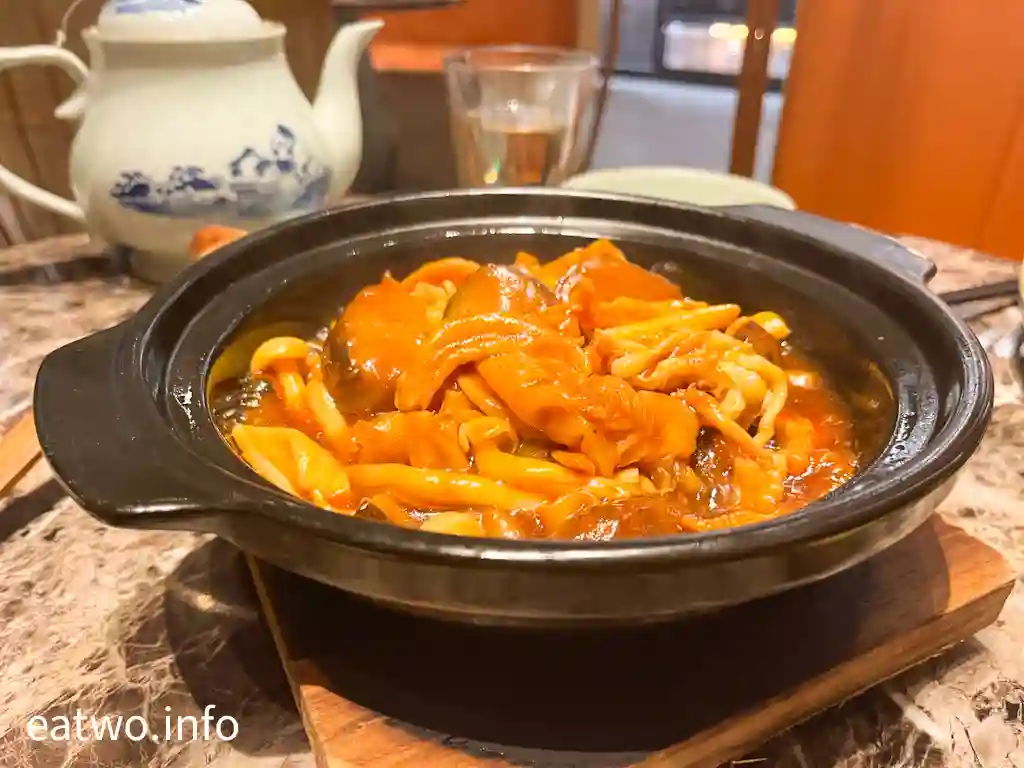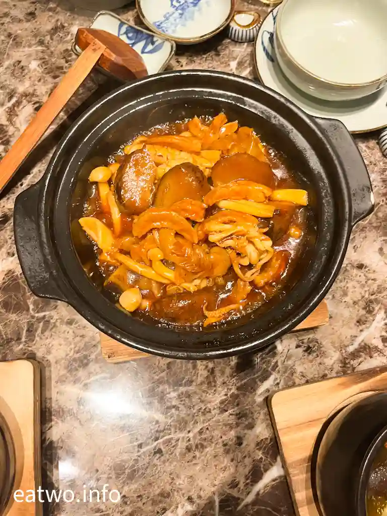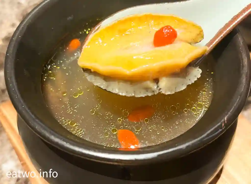 佛跳牆內係一盅湯,內有鮑魚、花膠、魚翅、海參、雞髀肉、杞子,一盅係一人份量,每樣基本都係得一件,除咗杞子。不過,海參軟嫩、鮑魚彈牙、花膠軟滑,魚翅亦算係一梳梳似裙翅口感,只係每人得一小撮。湯頭係不俗嘅,的確係有各式海味嘅味道,但一盅份量其實唔算多,只係一小碗湯水左右,都算係迷你版女士美容湯!