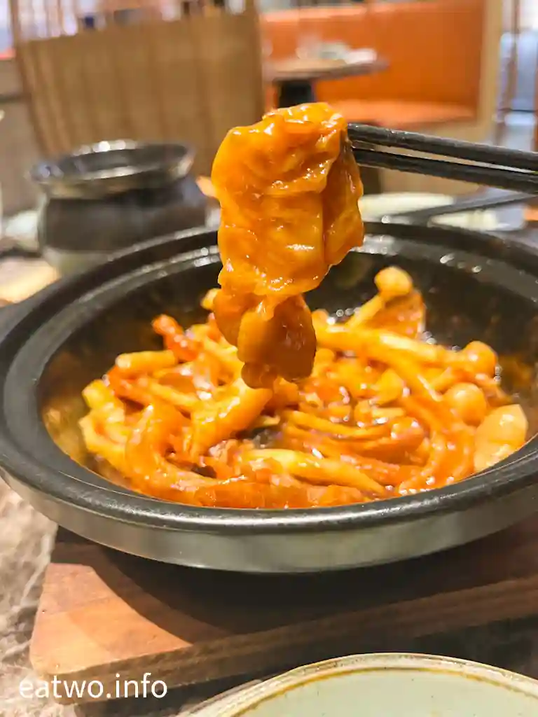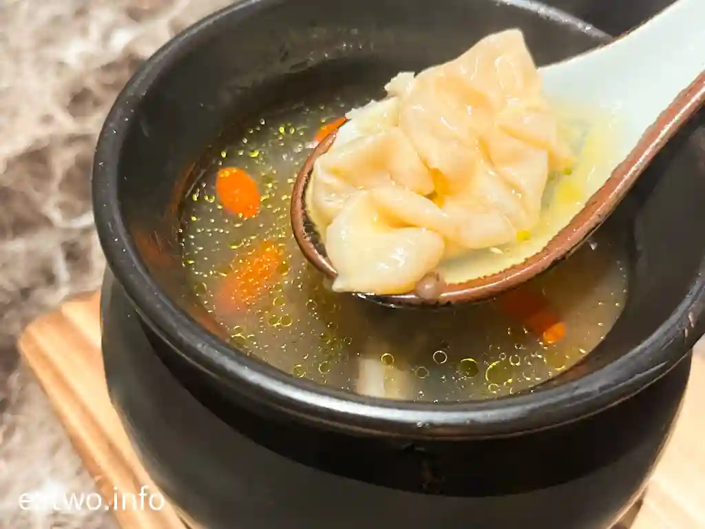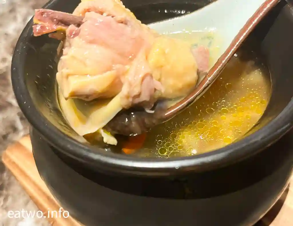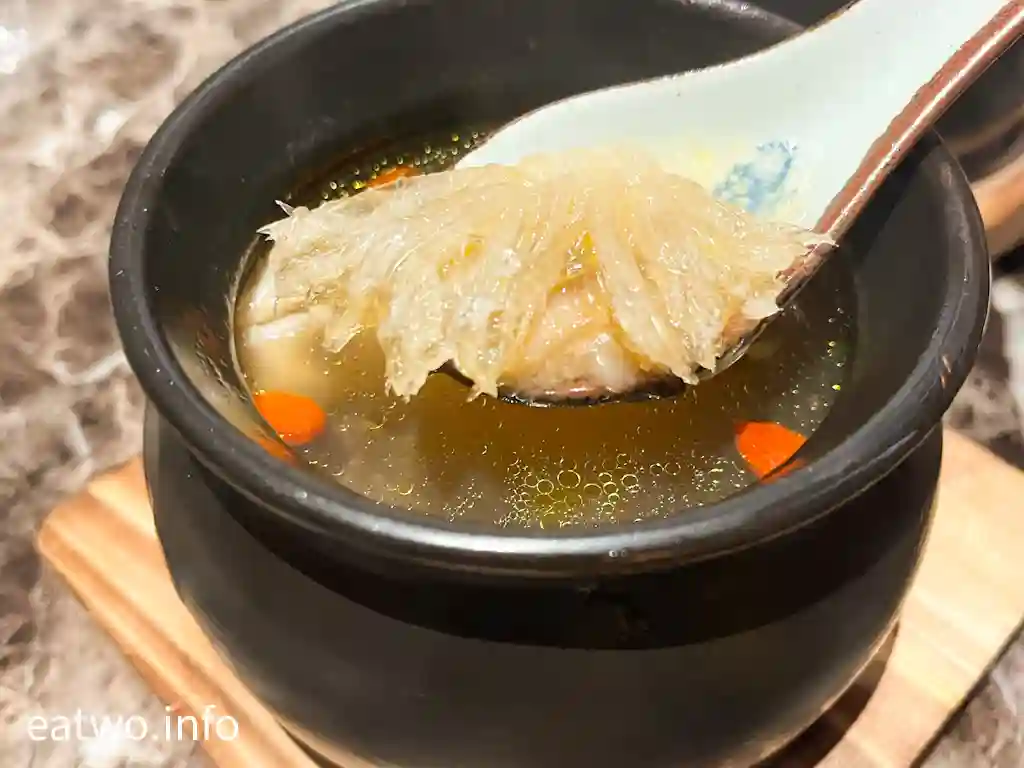 佛跳牆內係一盅湯,內有鮑魚、花膠、魚翅、海參、雞髀肉、杞子,一盅係一人份量,每樣基本都係得一件,除咗杞子。不過,海參軟嫩、鮑魚彈牙、花膠軟滑,魚翅亦算係一梳梳似裙翅口感,只係每人得一小撮。湯頭係不俗嘅,的確係有各式海味嘅味道,但一盅份量其實唔算多,只係一小碗湯水左右,都算係迷你版女士美容湯!