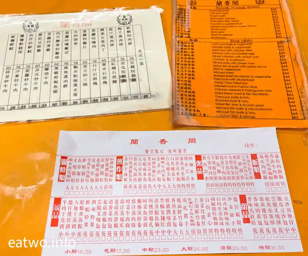 「蘭香閣」點心價錢由MOP16起,小點MOP16、花點MOP17、中點MOP23、大點MOP26、頂點MOP29、特點MOP31,相信大家唯一可能未見過嘅應該係花點,價格係介乎於小點同中點之間,而點心紙內都有唔少係花點。點心紙有唔少懷舊點心,另有生滾粥、湯粉麵等可以選擇。