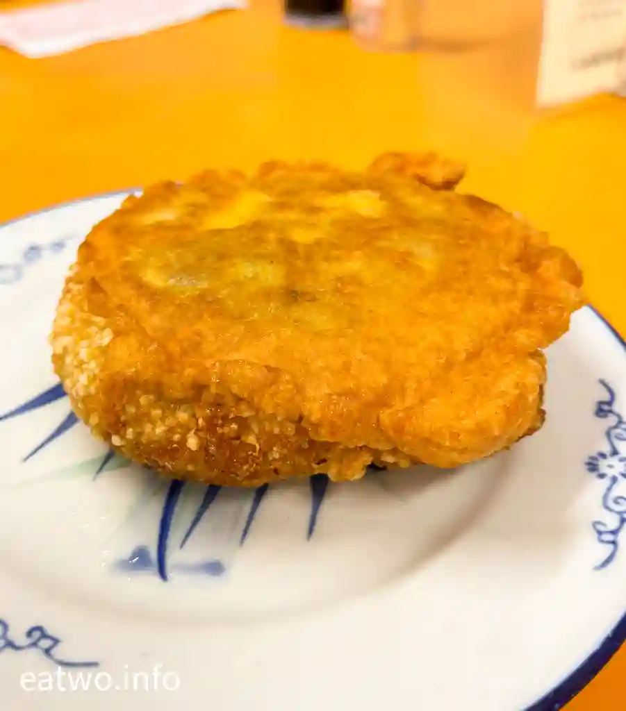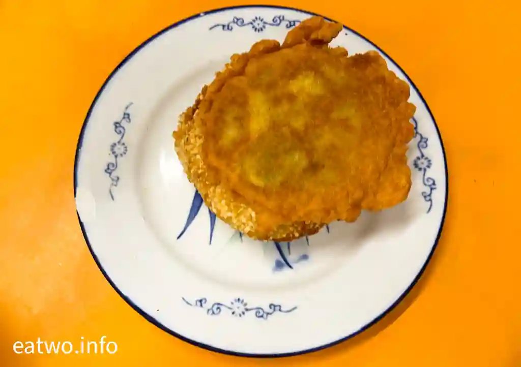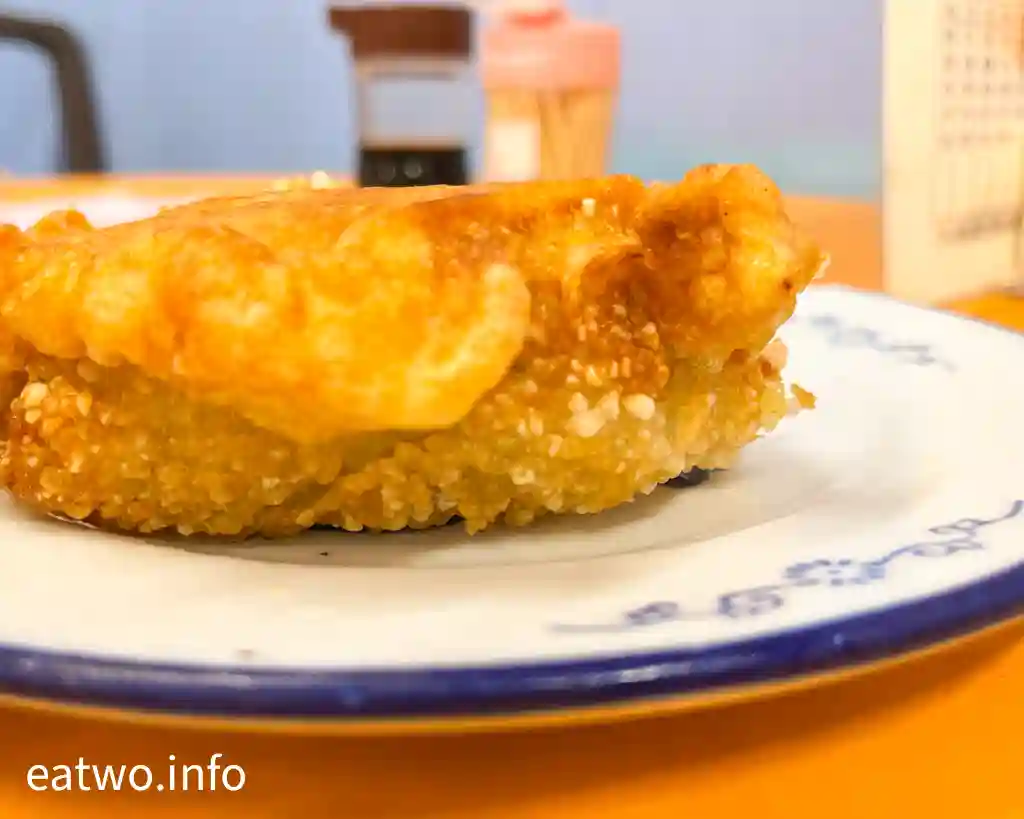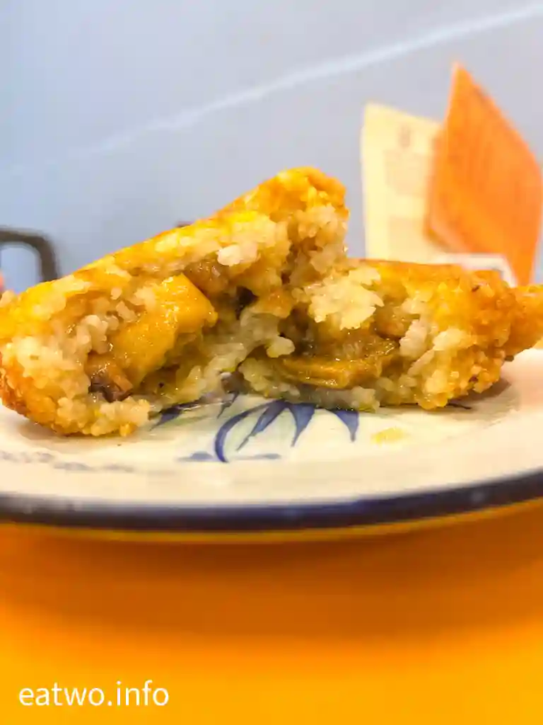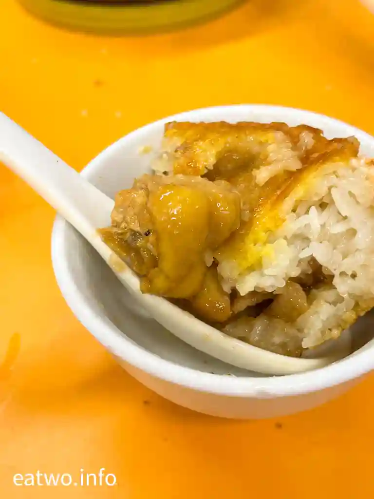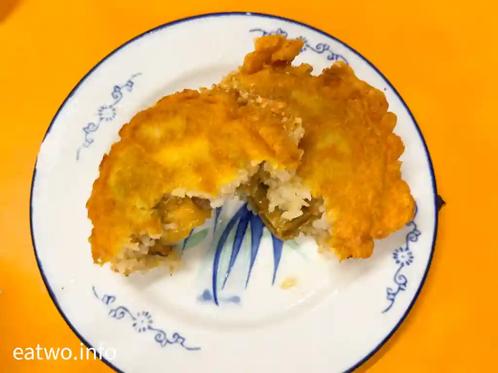 而清香蒸米鷄係頂點,蛋黃煎米鷄則為特點,睇到呢度,終於有一款係港式茶樓或酒樓已經唔會見到嘅點心,個「鷄」字甚至唔係香港人平時用開嘅「雞」字。清香蒸米鷄即係蒸糯米雞,而蛋黃煎米鷄就係煎糯米雞。將原隻糯米雞沾滿蛋液,再放落鑊煎香,既可充滿蛋香,邊緣亦更容易煎至脆卜卜,比蒸糯米雞更香口惹味!將蛋黃煎米鷄咬下口,就似一餅煎香飯糰,飯粒邊緣入口焦脆,就好似飯焦一樣!內餡同普遍糯米雞無異,都係有豬肉,甚至雞肉等等。