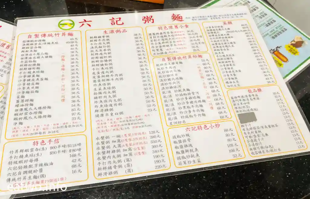 「六記粥麵」最出名嘅係水蟹粥、蝦籽撈麵、炸鴛鴦、滷水鳳爪,香港嘅鴛鴦係咖啡溝奶茶,而澳門呢間食肆所謂嘅鴛鴦,即係炸雲吞、米通鯪魚球,都係受澳門人歡迎之作。據悉,該店有60幾間菜式,所以就直接叫做「六記」。