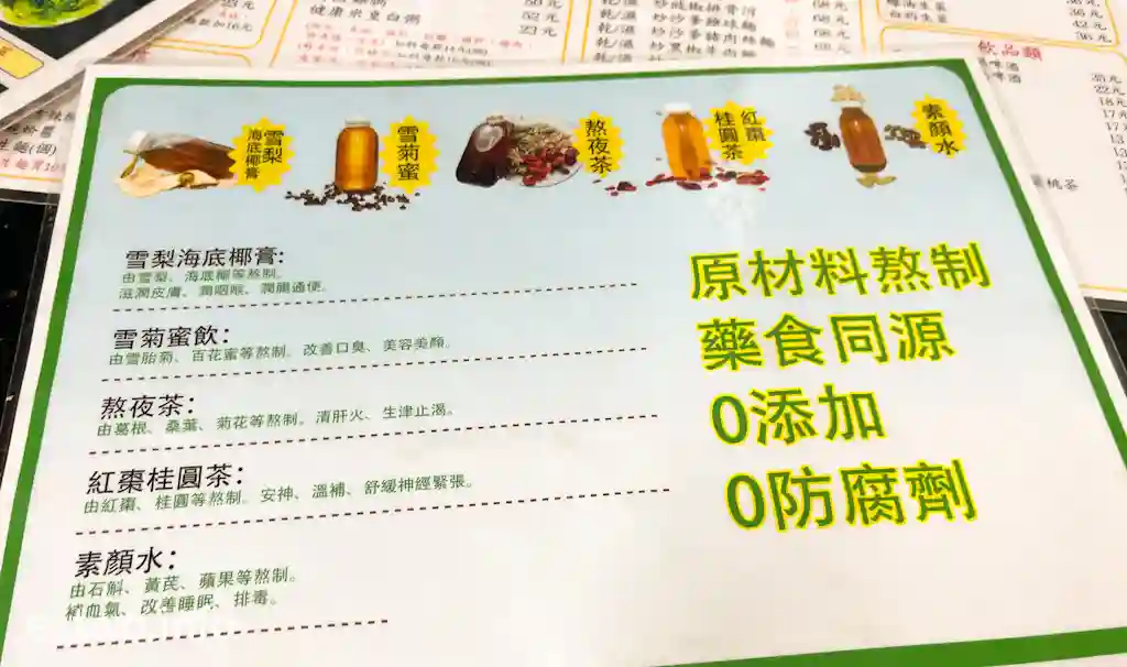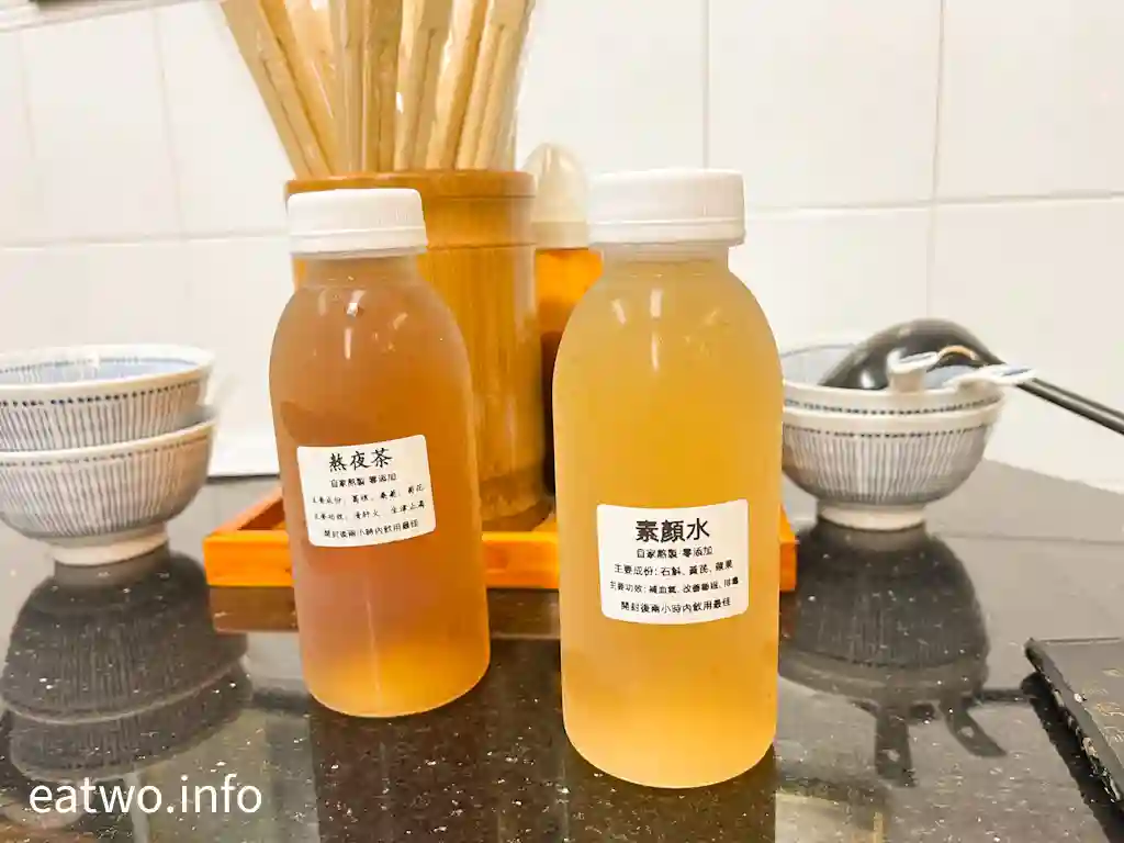 飲品有支裝健康涼茶可以選擇,包括有熬夜茶MOP22,含田葛根、桑葉、菊花,可清肝火及生津止渴;另有素顏水MOP22,含可斛、黃芪、蘋果,可補血氣、改善睡眠及排毒。兩支茶入口都係比較清淡,基本上係無糖,但就好冰涼。