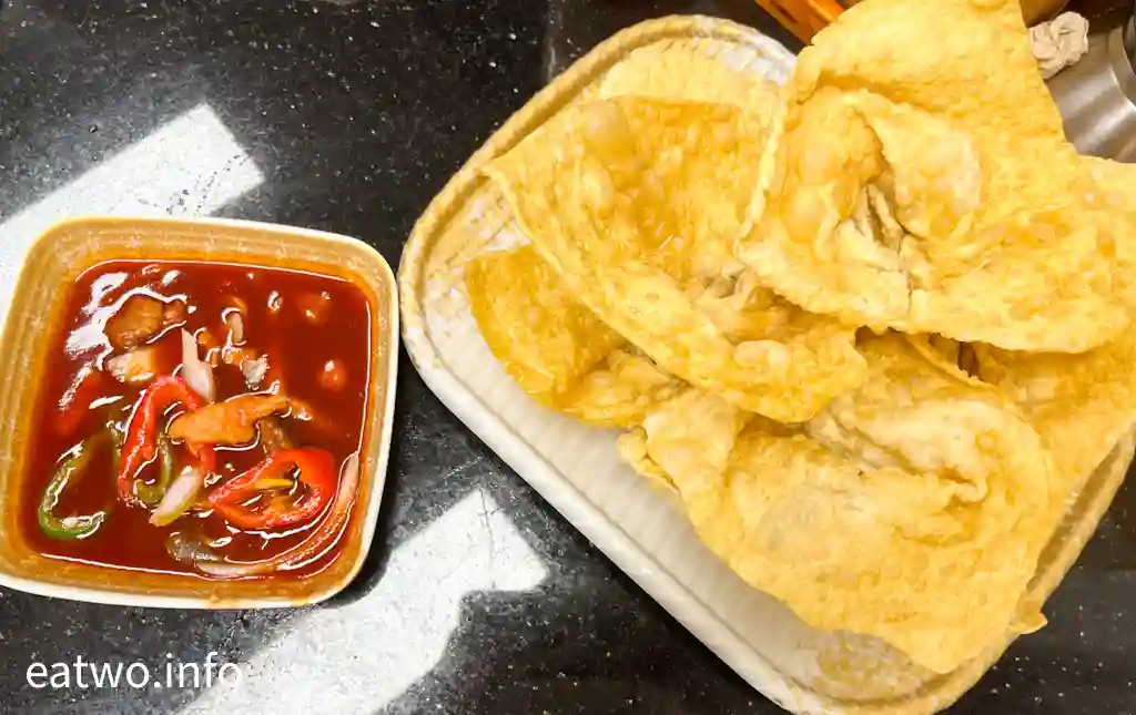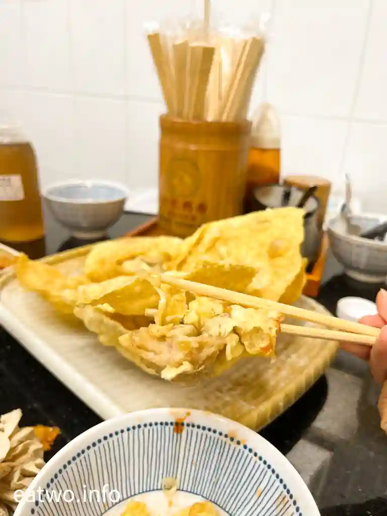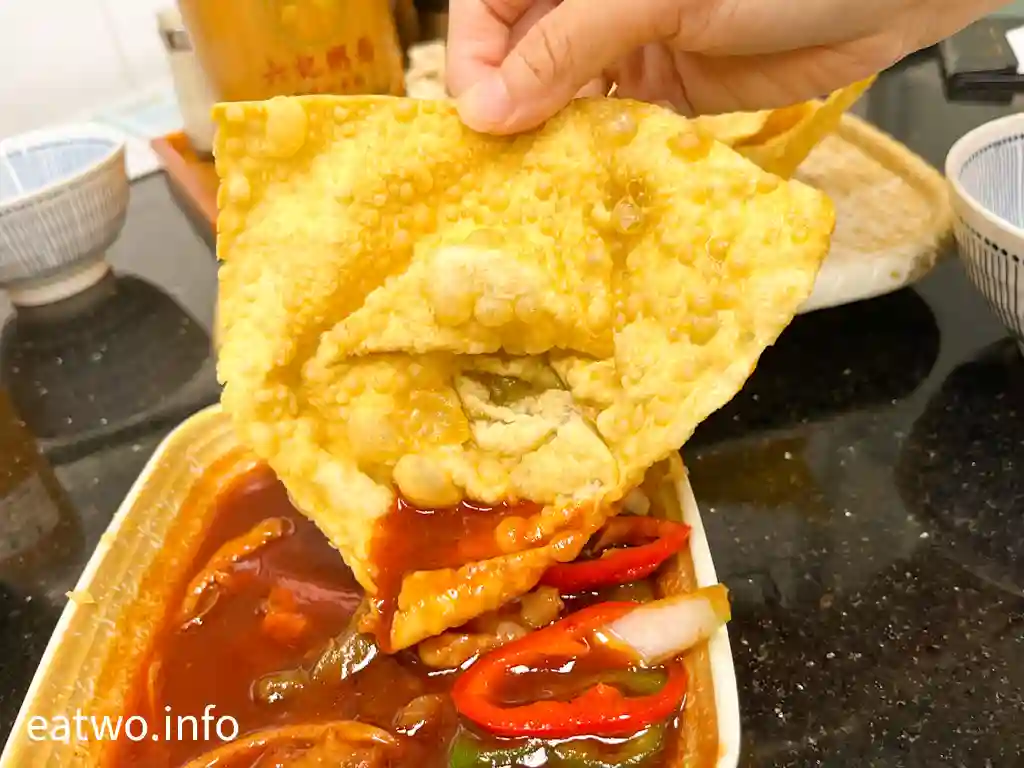 而「鴛鴦」嘅另一半,就係懷舊錦鹵炸雲吞MOP95,一份跟錦鹵汁。上檯一刻令人意外,因為份量頗多,而且炸成極大隻,大概有7至8隻,每一隻size相近。雲吞包裹成三角形至四角形,中間餡料有蝦肉同蝦米,但就比較細小,表皮較大塊。雲吞皮又厚又大塊,有蛋香味,但有少少鹼水味。雲吞皮可以點好多次酸酸甜甜嘅錦鹵汁,只係比較膩,食多幾塊就覺得好滯,如果有小份選擇就更好,香港已經好少可以食到。