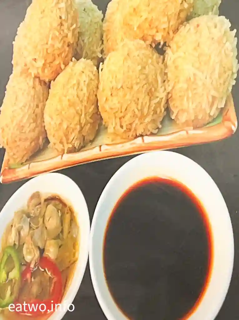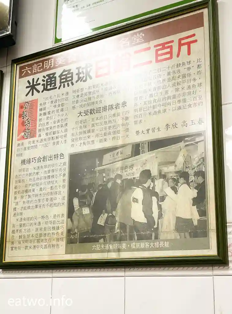 睇店內嘅介紹,原來米通魚球先至係「六記粥麵」數一數二嘅小食,首創米通鯪魚球﹐MOP95 有一份,MOP55 得半份,跟蜆蚧醬。將鯪魚球炸成金黃色,營造外脆內軟口感,肉質彈牙,大小似乒乓波,表皮同時黏滿脆口米通,唔少當地人都會排隊購買!