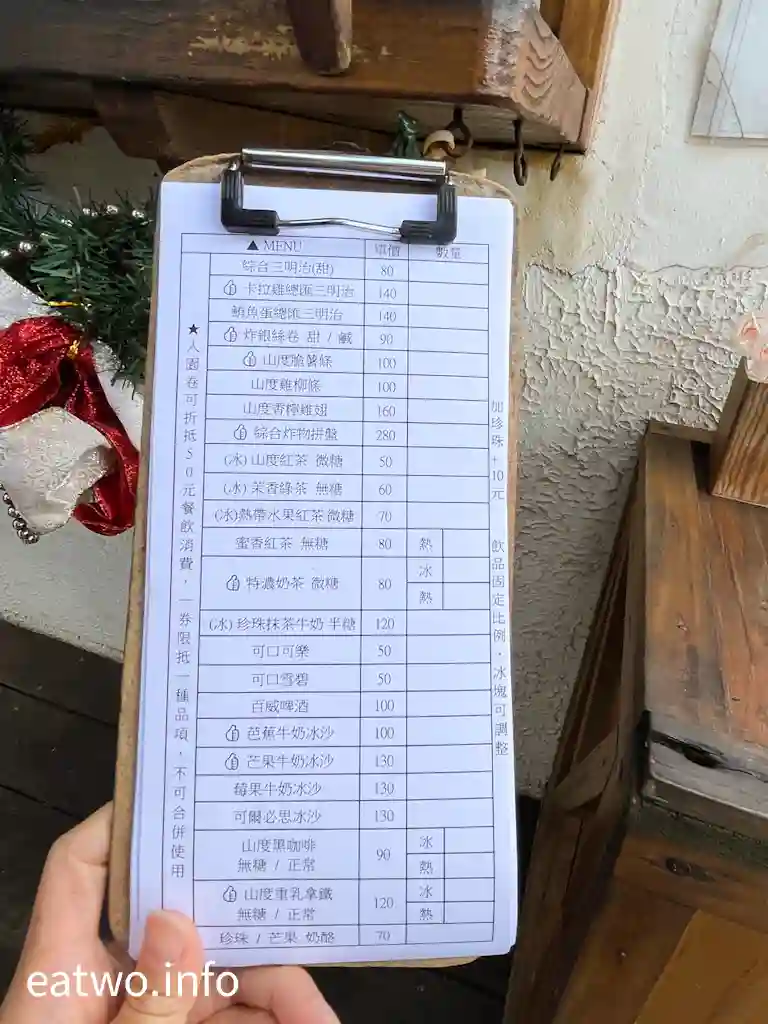 該店並非只有打卡位,近入口處有個小食亭,亦有「Hi~花蓮!」招牌,點餐區有少量飲品及小食售賣,比如係山度雞柳條TWD100、山度香檸雞翅TWD160、綜合炸物拼盤TWD280,一杯山度紅茶TWD50、而一杯茉香綠茶TWD60,基本上只係簡單小吃,無乜太大特別。