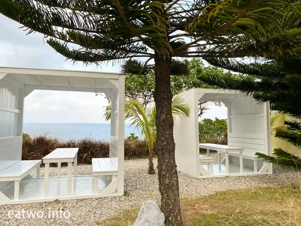 繼續向內走,會發現當中有更多藝術裝置,包括一個又一個帳幕式座位,於地面購買餐點後,可以上嚟慢慢食,背靠青翠山巒,正對湛藍海洋,環境舒適。