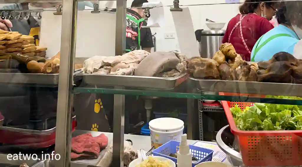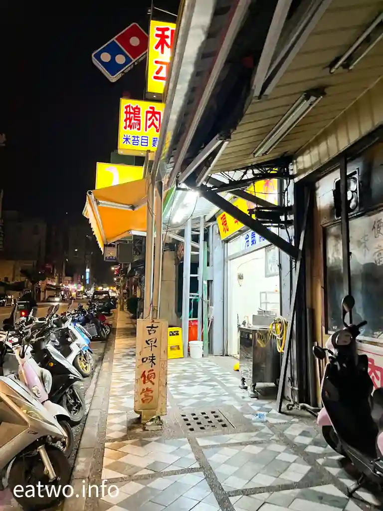 從門口招牌可見,店內以鵝肉為主打,甫踏入門口就會見到鵝肉同小菜櫃,可以直接點餐,當中都有唔少鵝肉以外嘅菜式。店內有鵝油飯TWD25、肉燥飯TWD30、麻醬麵TWD65、扁食麵TWD75、陽春麵TWD60、米苔目TWD60、鵝肉湯TWD70、肝蓮湯TWD50、鵝肉麵TWD120,宵夜選擇不少,店內更有鵝油售賣,而該店同時寫明菜式會內含辣椒、沾醬。
