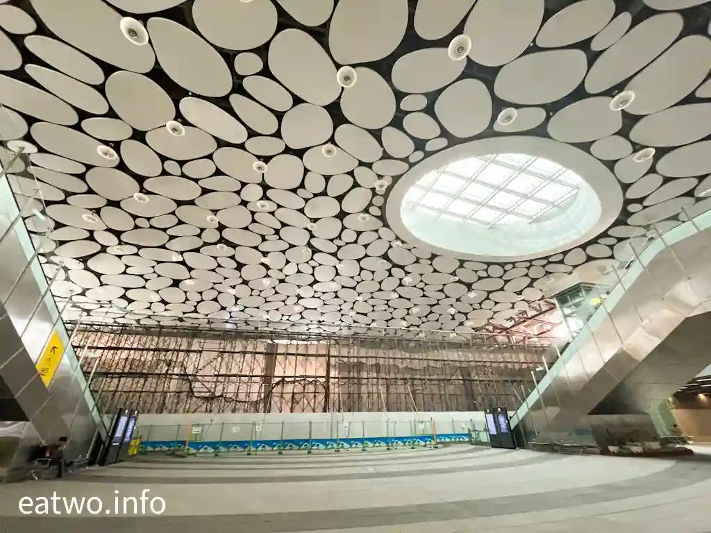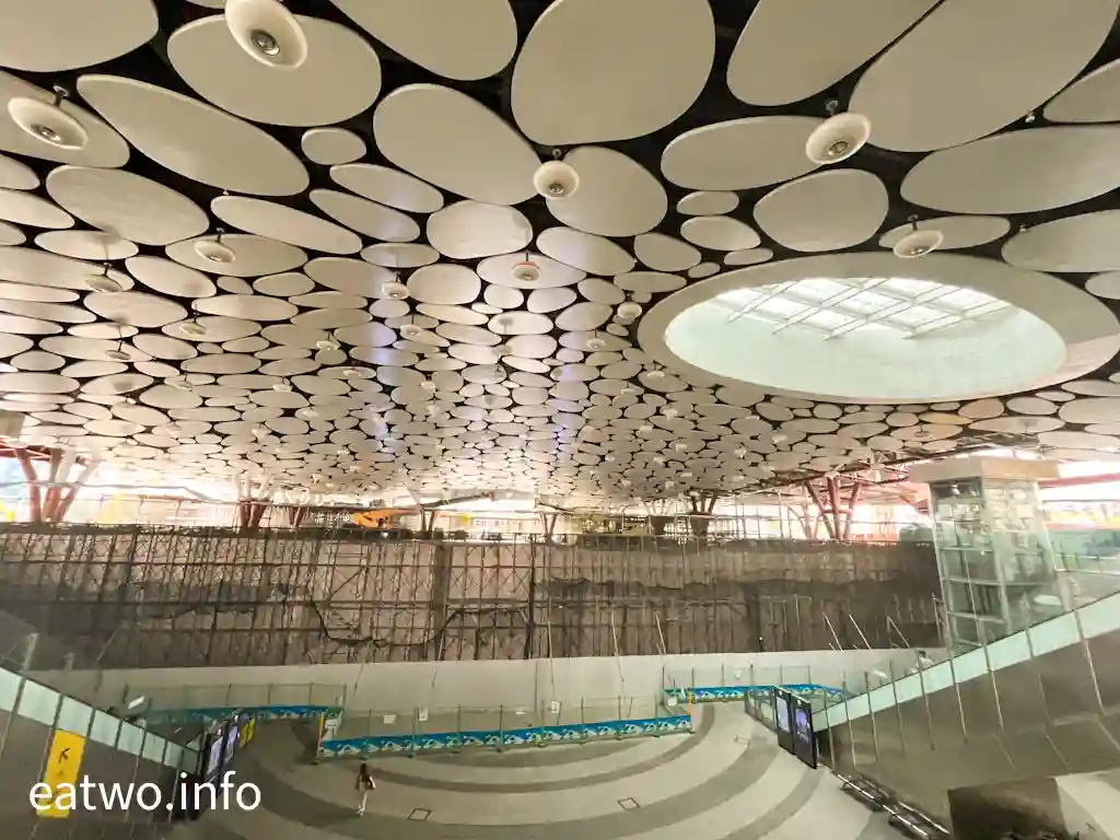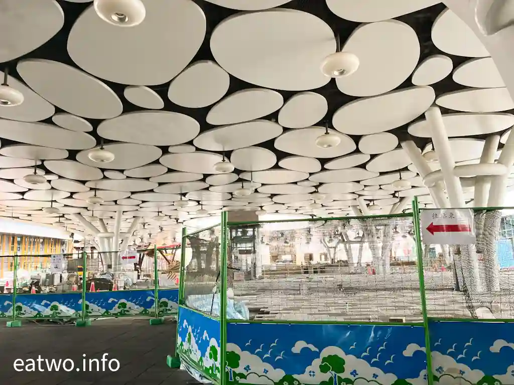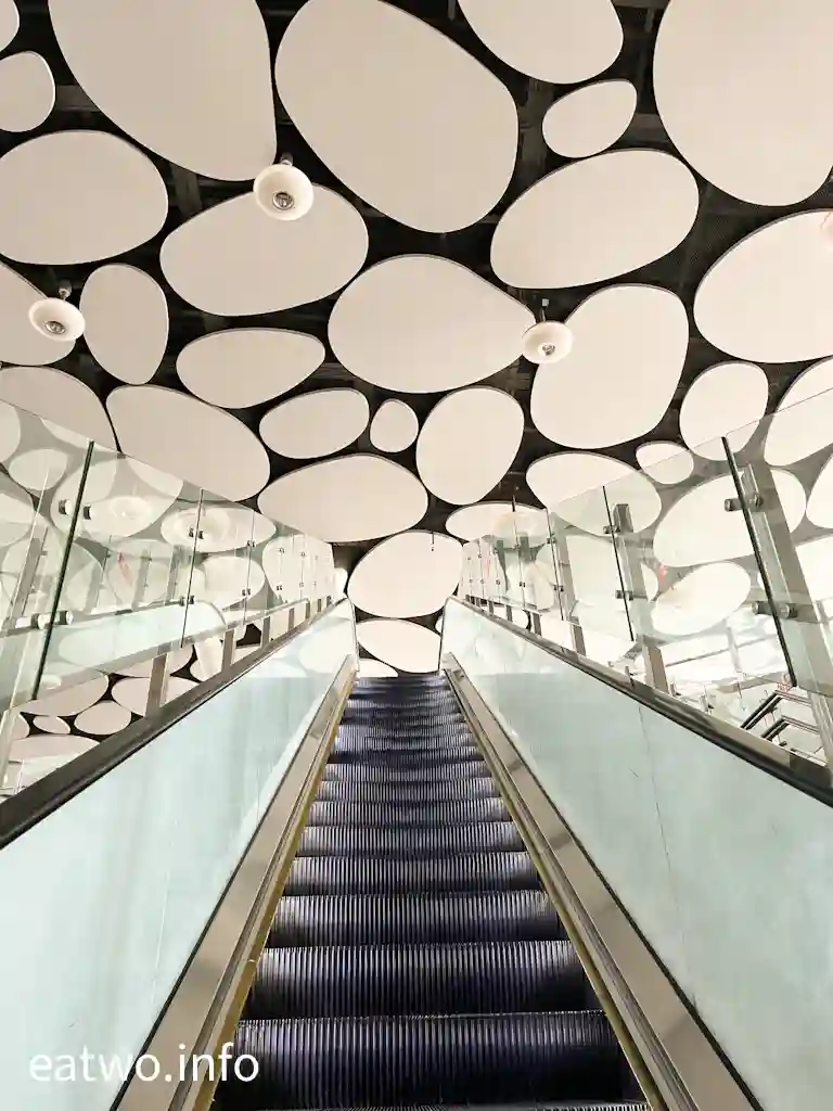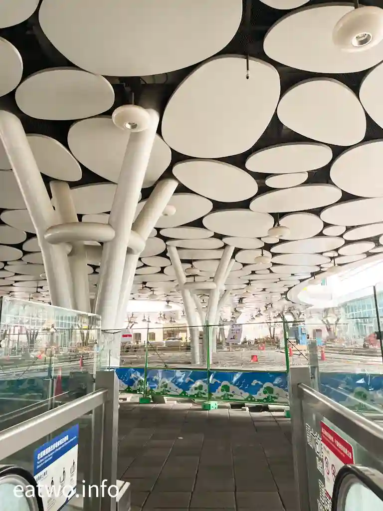 而車站屋頂就被綠植覆蓋,以大量草皮設計,既可遮蓋炙熱太陽,亦可美化車站。而空中花園、行人步道就未有開放,需要等2024年底或2025年先可以前往參觀。雖然原意係想以雲朵造型勾勒天花,但現實所見,天花只係一個個純白圈圈,抬頭望上「天空」,反而有種密集恐懼症感覺,令人毛骨悚然!