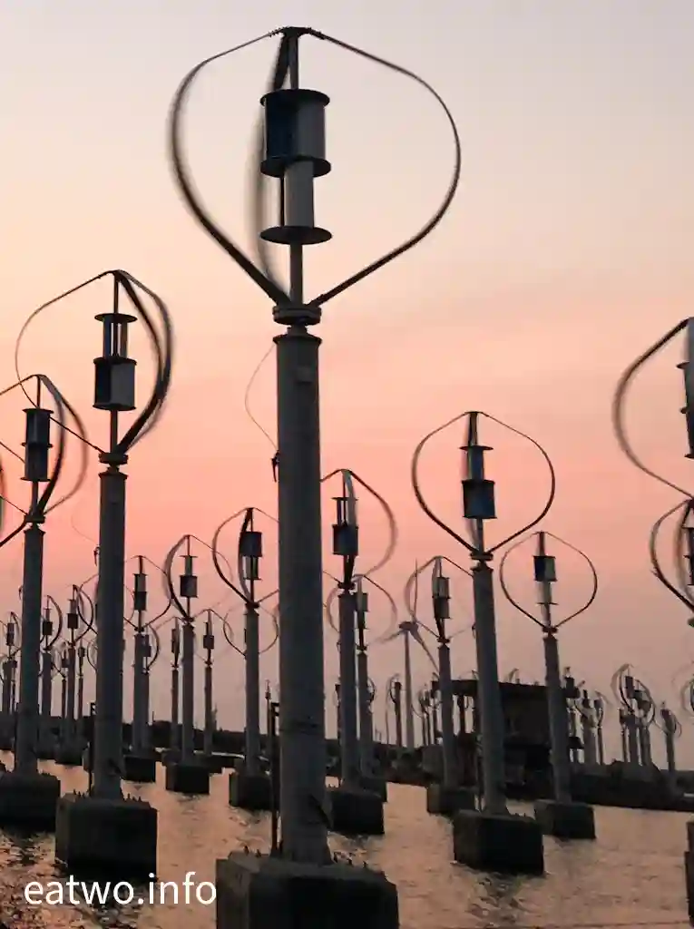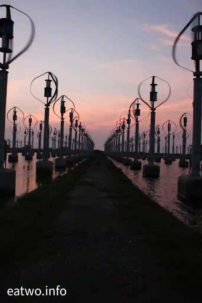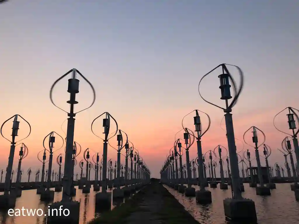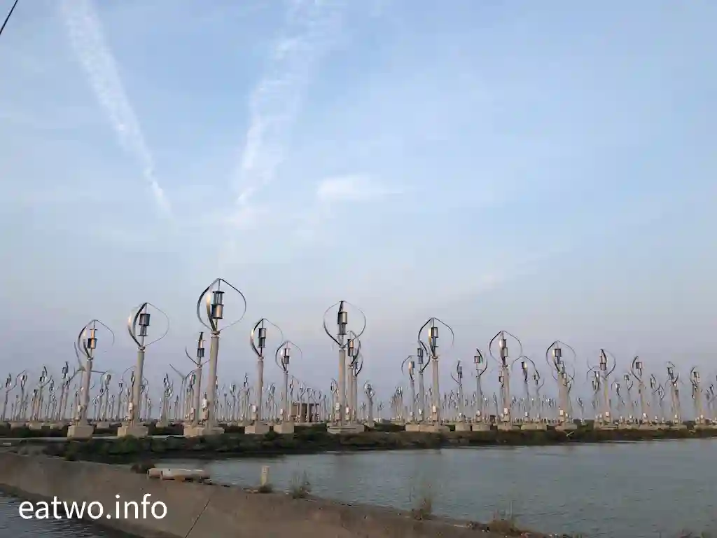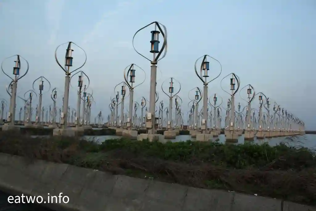 據了解,現場係有超過400座直軸小型風力發電機,造型似足小風車。細心留意現場嘅一個個風車,發覺風車狀似蛋形,每座高約4米,並非平常見到嘅三支長條狀拼湊而成嘅風車形,造型頗為獨特。而風車內嘅風軸葉片必須要經空氣流轉先會旋轉,會經風產生能源,再推動發電機,最後會產生電力,係一種天然嘅發電能源。