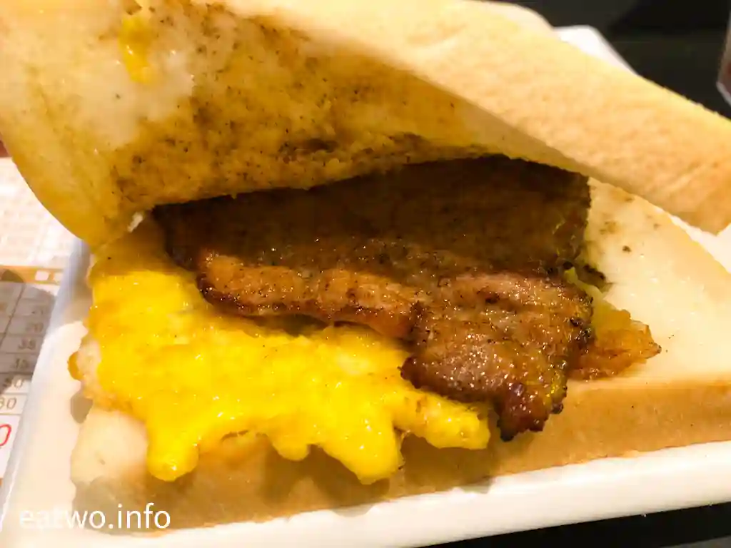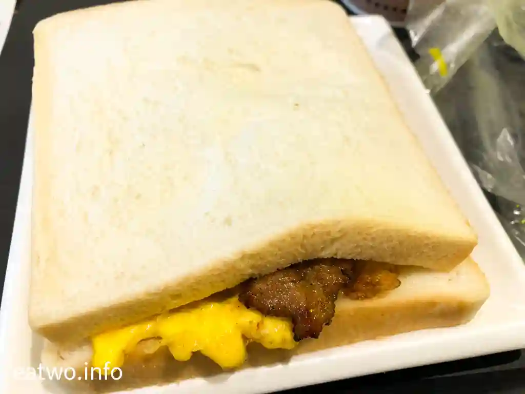 肉蛋土司、沙拉土司分別只係餡料唔同,肉蛋土司入面就係滑蛋配一塊豬扒肉,燒肉片好香口,偏薄身,入口軟腍,而且單靠古早味醬汁都醃得入味,鹹中有甜,而且似係水果嘅甜味;沙拉土司入而就只係得沙律,但就係滿滿律律餡料,沙律入面就有薯仔,感覺好fresh。