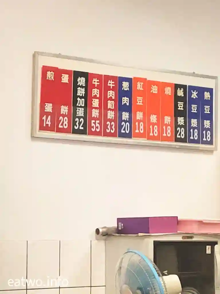 從該店餐牌可見,其實主要就只係得吐司、蛋餅、蘿蔔糕、鍋貼、煎包,亦有招牌豆漿、奶茶紅茶等飲料。當中,招牌肉蛋土司TWD45、招牌沙拉土司TWD45,其他土司餡料有夾肉、肉鬆蛋、培根蛋、火腿蛋、玉米蔥蛋、起司蛋等;而蛋餅餡料則有香蔥、肉鬆、培根、鮪魚、起司、夾肉、泡菜等,價格只係TWD20至45。基本上除咗單點小吃蘿蔔糕、鍋貼、煎包,其他食材都好相近。