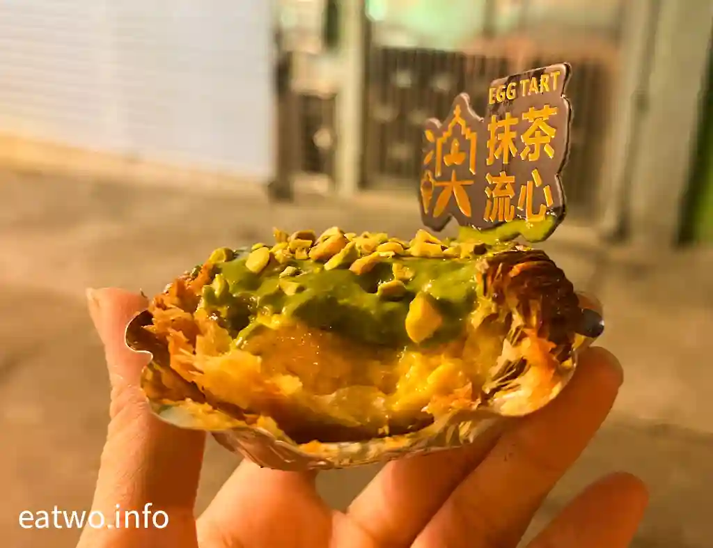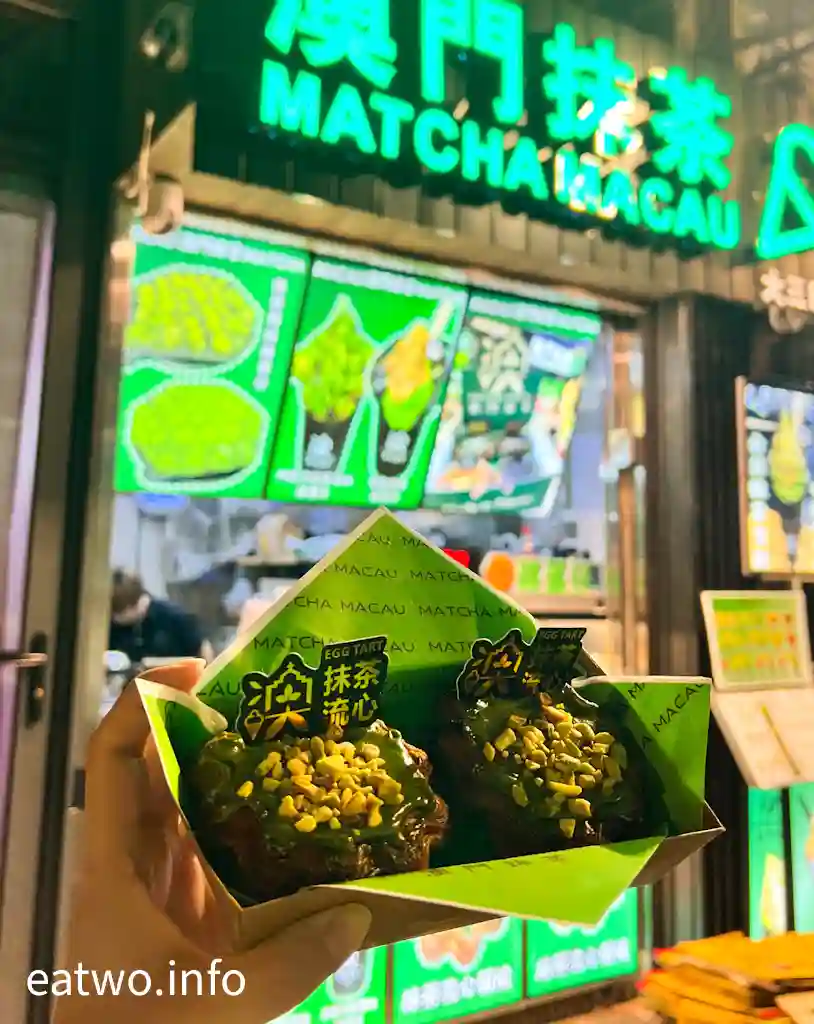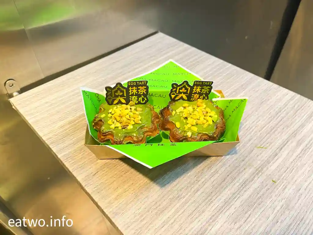 小食就有黑金抹茶雞蛋仔、朱古力抹茶雪糕雞蛋仔、抹茶葡撻雞蛋仔、特濃抹茶雞蛋仔,分別為MOP38至45。比較特別啲嘅就係將抹茶加入澳門葡撻內,招牌之一就係抹茶流心葡撻,一件賣MOP20,兩件則賣MOP35/2。