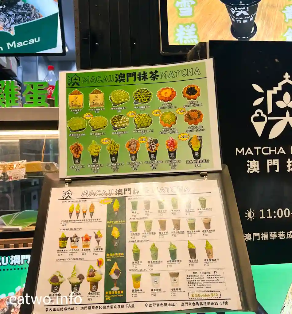 店內以特濃宇治抹茶為主打,包括有宇治抹茶雪糕MOP42、抹茶雪山MOP49,另有金箔抹茶、金箔芭菲、金箔抹茶雪糕有可食用黃金、抹茶拿鐵漂浮、焙茶拿鐵漂浮,價格由MOP38至52。