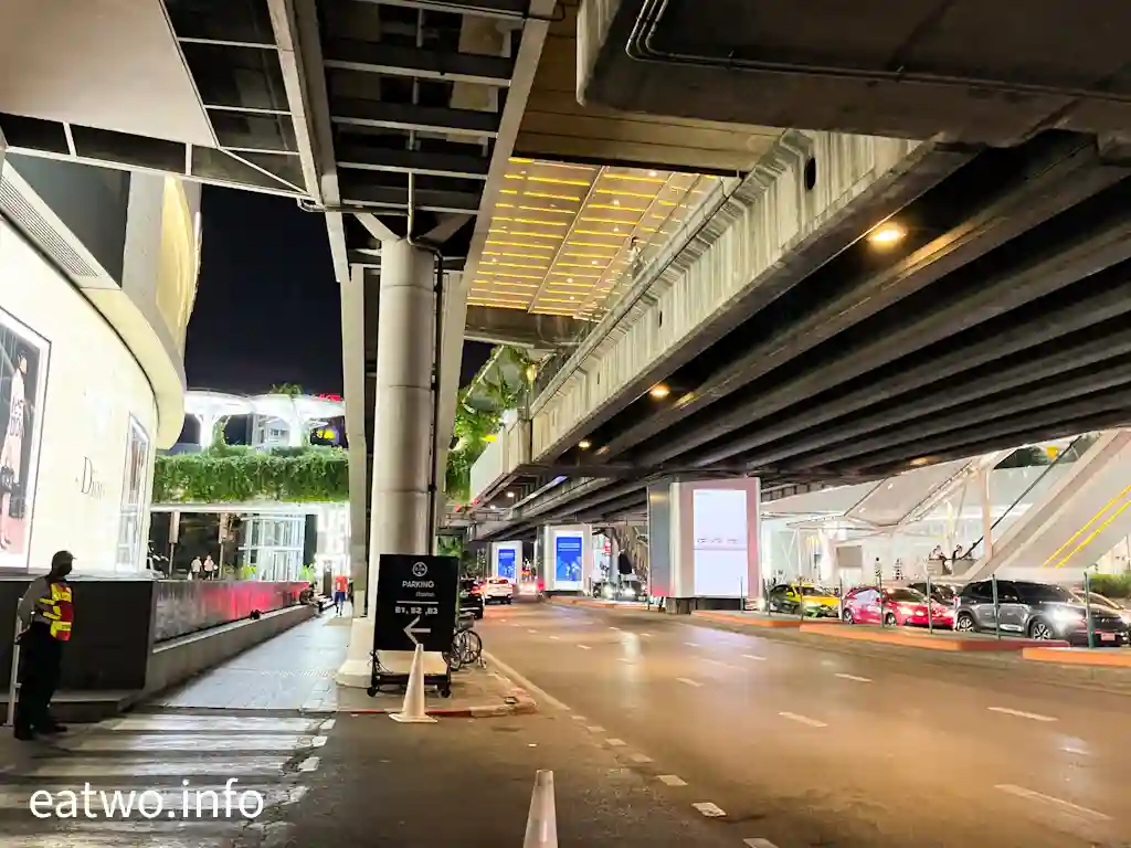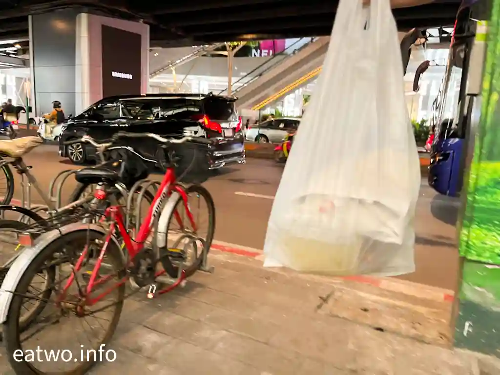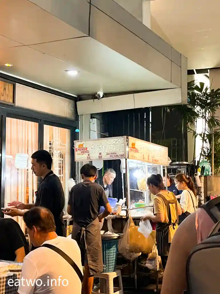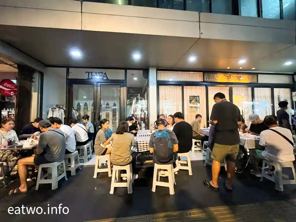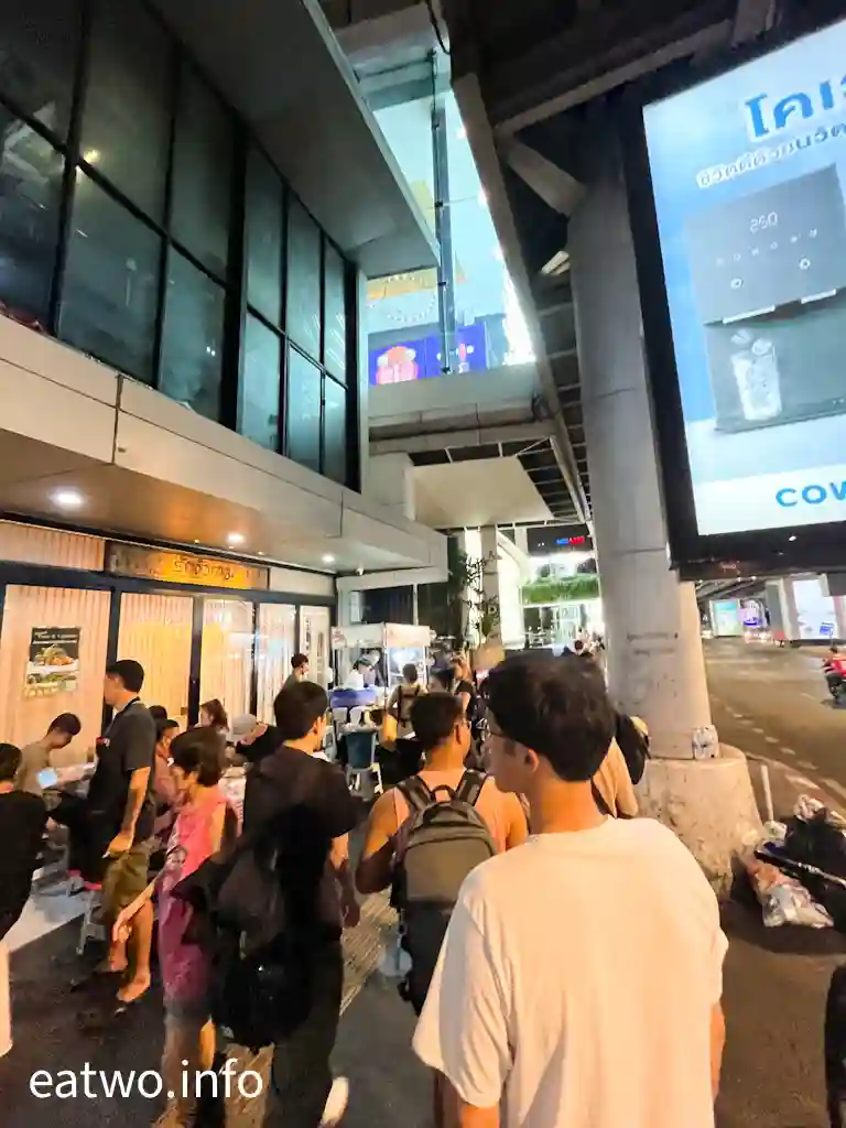 車仔檔擺放BTS站樓下,旁邊就有幾張鋪上檯布嘅餐檯,每張檯都坐滿客人,天橋下馬路邊就有一條人龍,一直排隊等候入座,但客人流轉度都算高。雖然該店係路邊攤,但當地人都完全唔介意坐路邊食飯。不過,我哋當日有啲唔舒服想直接返酒店休息,所以只係買外賣,未有堂食。