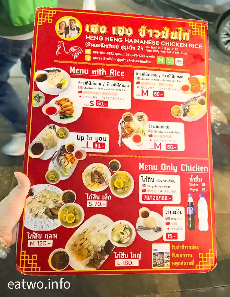 「興興海南雞飯」完全只係曼谷一間街頭小店,全店只有一種食物可以選擇,就係海南雞飯。Chicken with Rice 泰式雞肉飯分兩種size,一碟size s賣50泰銖,中size m賣60泰銖,大size l就賣80泰銖。店內重有款炸雞飯60泰銖,而齋雞肉就賣70、120、180泰銖,加飯15泰銖。