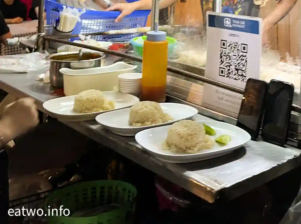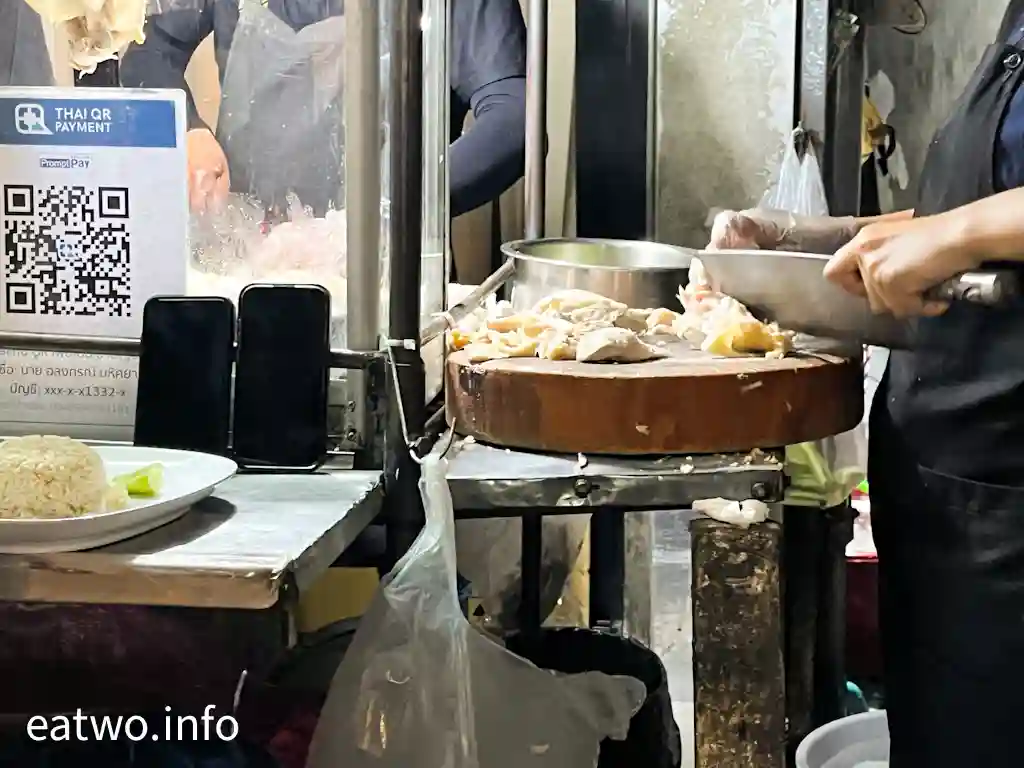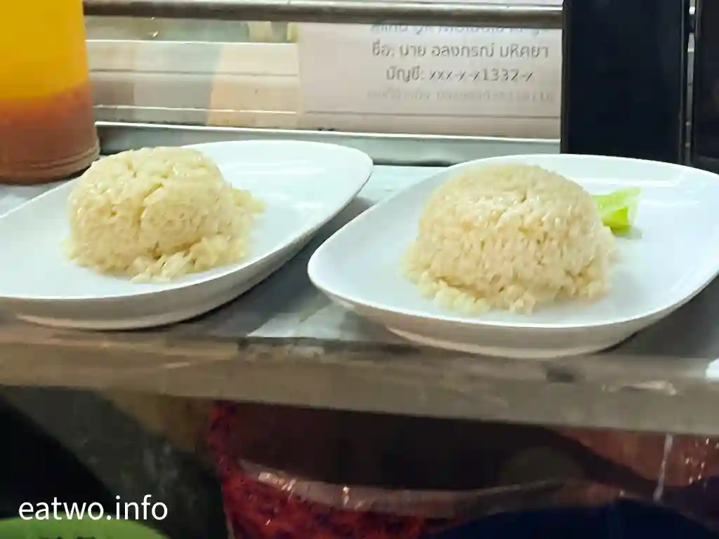 曼谷水門市場最受歡迎嘅就係海南雞飯,綠色招牌嘅「廣興海南雞飯」係最多分店,粉紅色招牌嘅「紅大哥海南雞飯」就係泰國《米芝蓮指南》嘅選擇。上述兩間海南雞飯都係唔少香港人認識嘅食店,雖則水準唔差,但E.A.Two另有更好選擇。該海南雞飯店位置靠近BTS站,雖然只係路邊攤,但雞飯水準令人難忘。