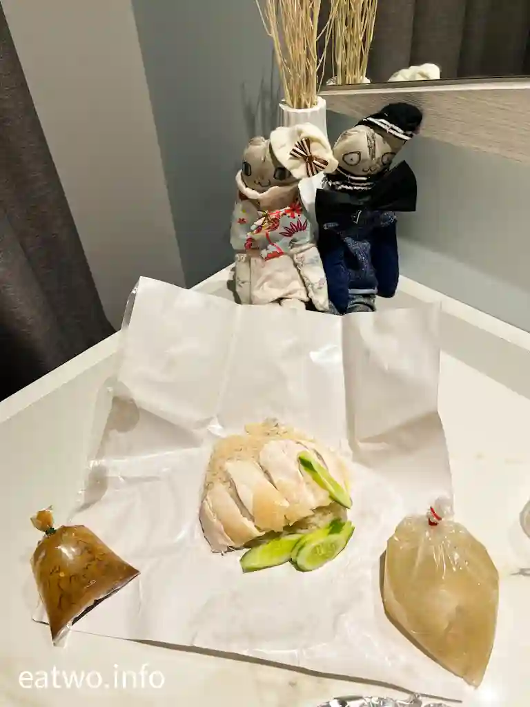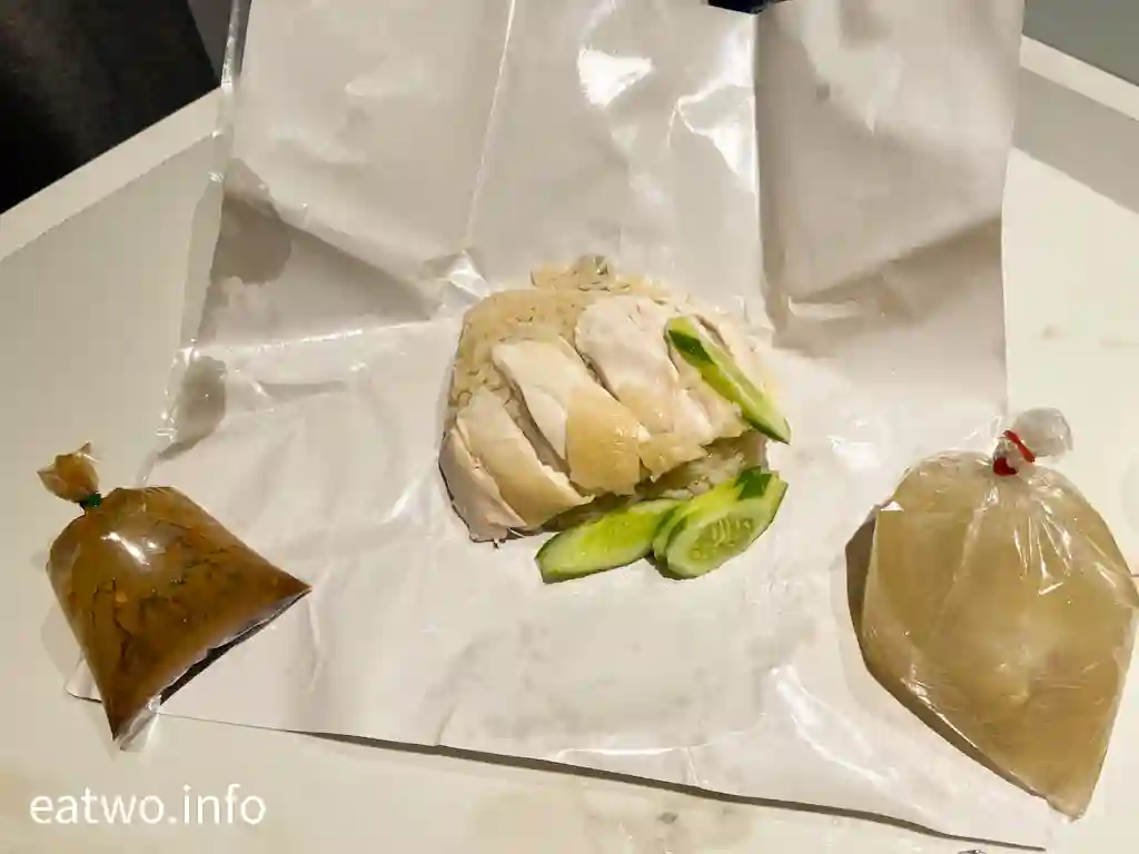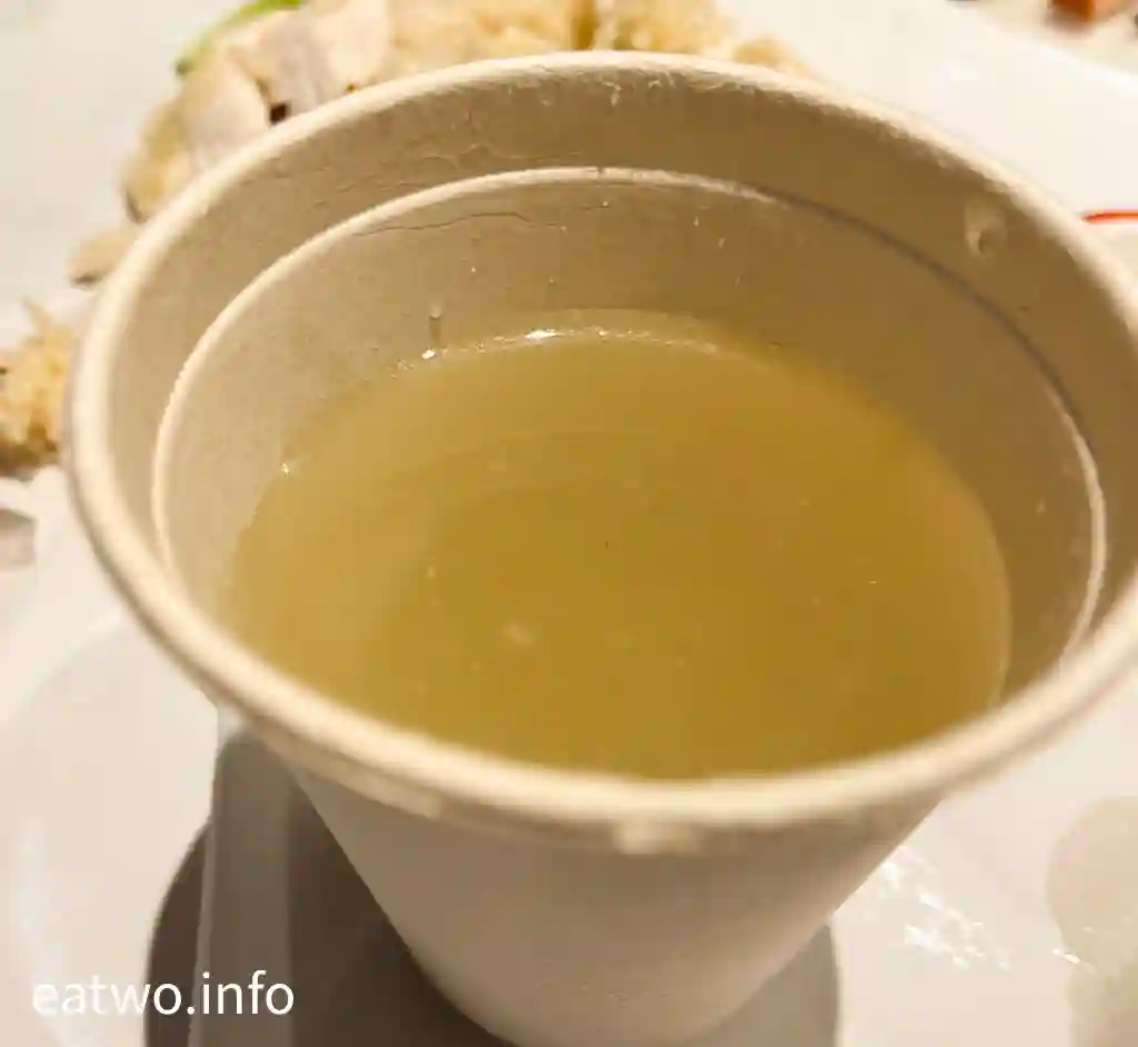 每一份雞飯都會附上雞骨湯,但外賣全部都無碗或碟盛載,並以膠袋盛載雞骨湯、醬汁,以紙包住雞飯。店內嘅雞湯比起水門市場粉紅色、綠色嘅雞湯更濃郁,而且係鮮甜雞湯味,有雞骨味之餘,亦有冬瓜,冬瓜煮得軟爛,幾乎入口即融,雞湯亦非加入胡椒或胡椒粉,非常清甜。