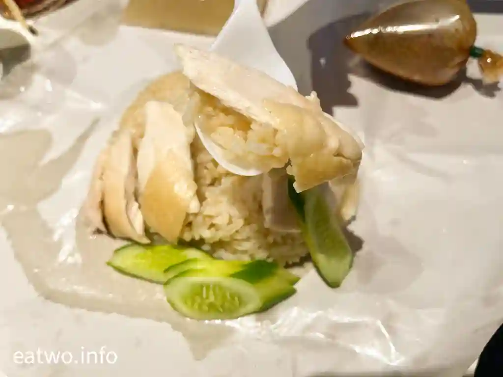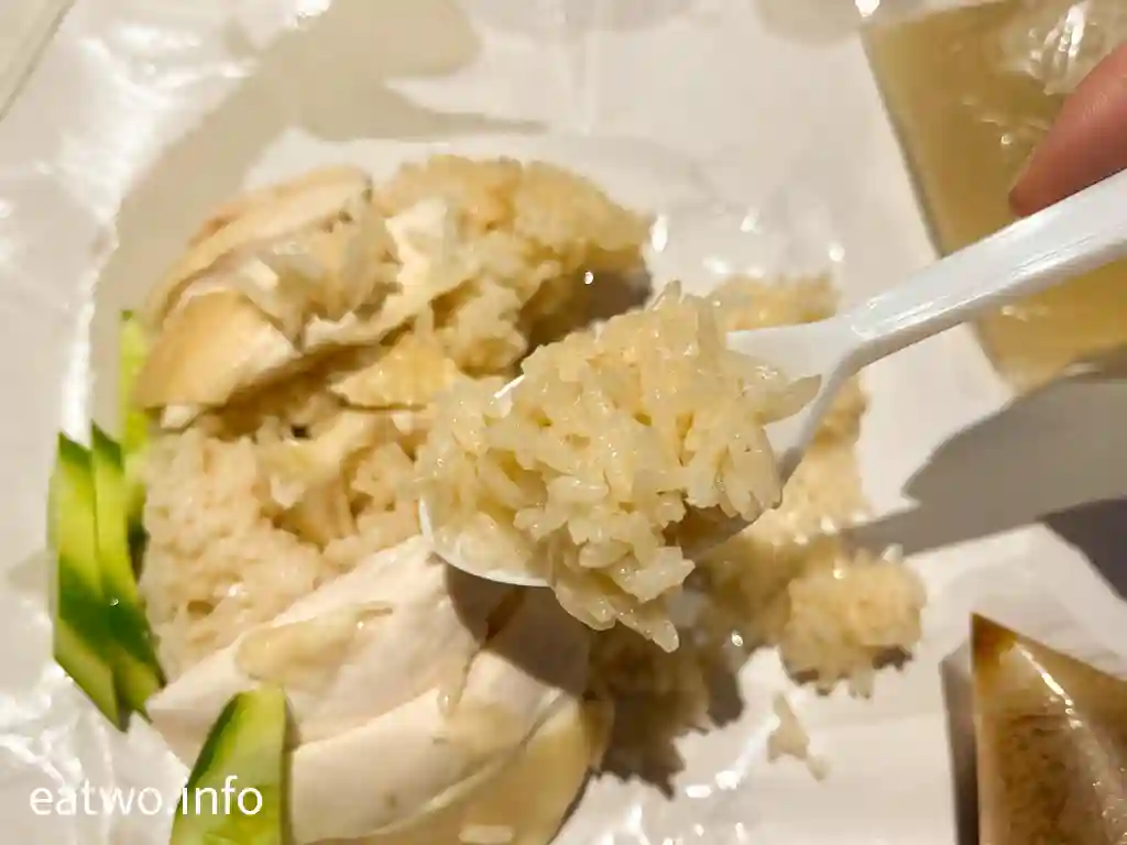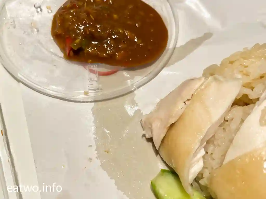 雞飯雖自帶鹹香,但同水門市場嗰兩間無太大分別。更特別之處係雞飯唔需要加入店內附上嘅醬汁,雖然雞肉配搭醬汁係更惹味,帶有微微辛辣味,但就算唔蘸醬汁都係令人意想不到。雞肉就別具風味,表面雪白,肉質鮮嫩,細膩而唔會乾柴,無論咩部位都咁軟滑,雞皮與雞肉之間有少少油脂感。雞肉好有雞味,香氣濃郁,入口唔會好油膩。