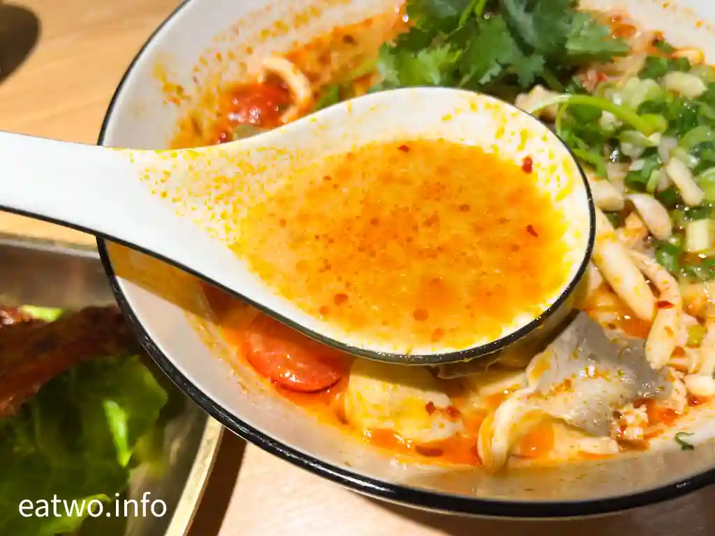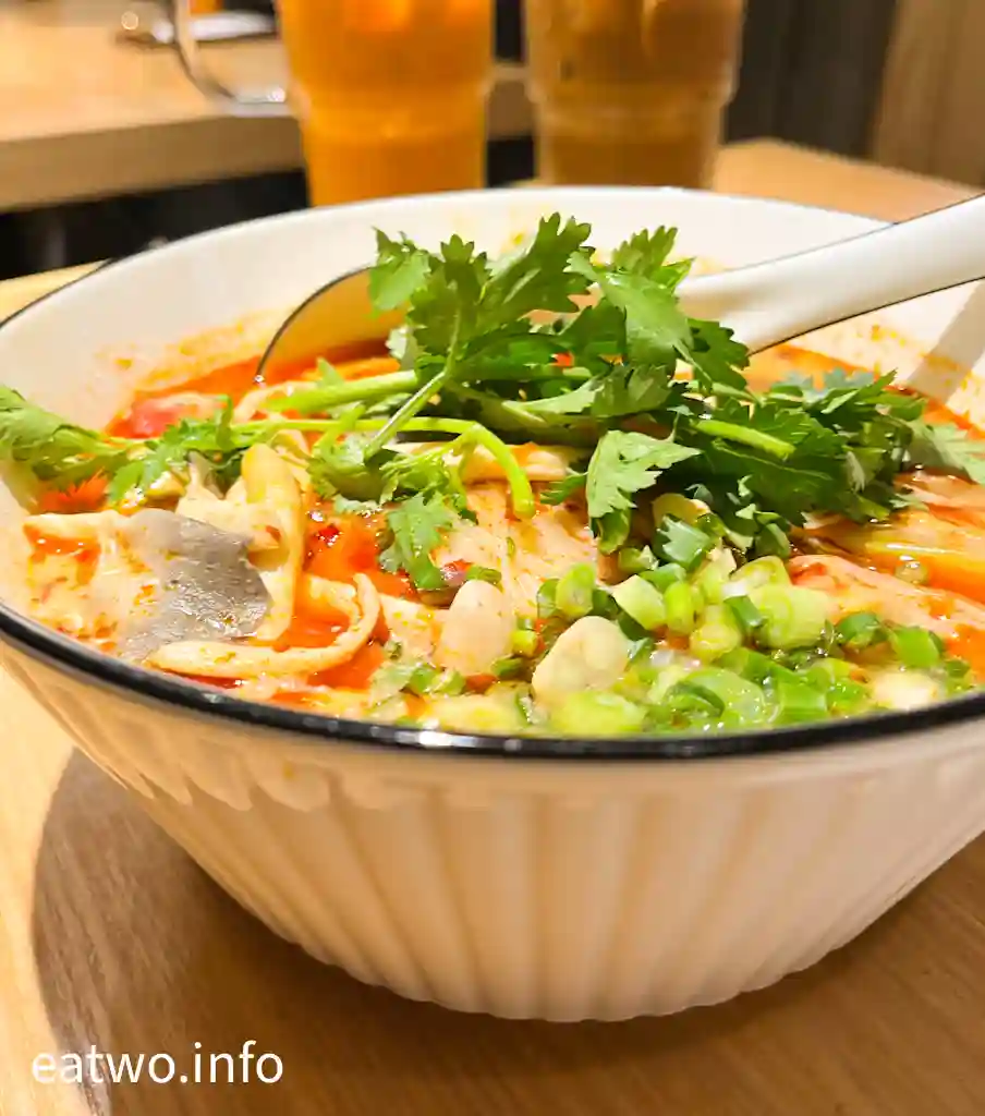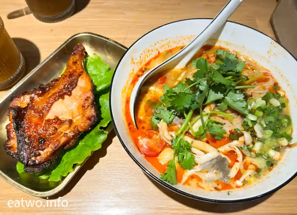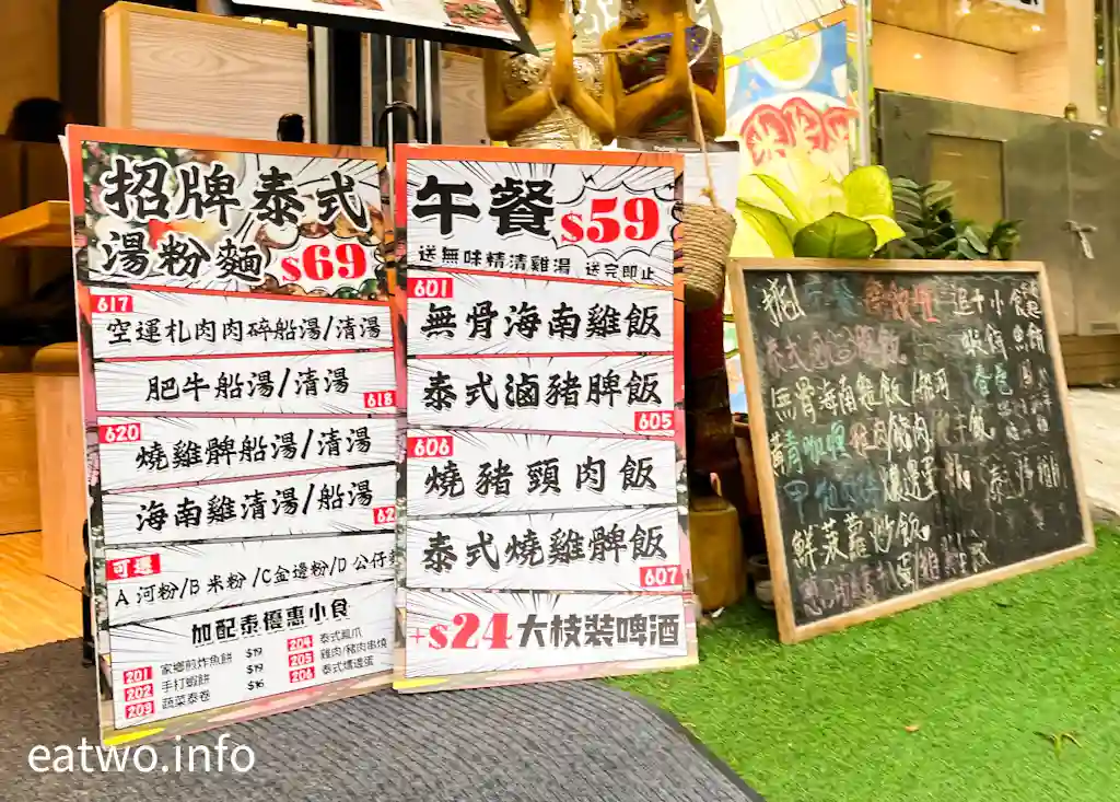 原先該米線店嘅菜式雖然唔算好特別,但豬手米線總算令人難忘。現時,該店完全轉型為一間泰國菜餐廳,以午餐為例,包含無味精清雞湯,每份$59。菜式選擇有無骨海南雞飯、泰式滷豬髀飯、燒豬頸肉飯、泰式燒雞髀飯,另有招牌泰式粉麵$69,空運札肉肉碎船湯、燒雞髀船湯、肥牛船湯、海南雞船湯等。