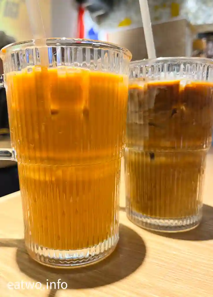 店內飲品有泰式奶茶、泰式咖啡,可跟餐配搭,泰式奶茶奶量比茶量多少少,紅茶味唔算太濃厚,反而奶味更重,所以係比較順滑;泰式咖啡就有啲驚喜,入口同一般咖啡唔同,入口有啲似凍朱古力,因為入面真係有可可咁嘅味。