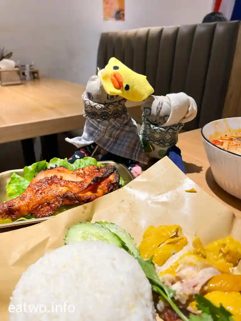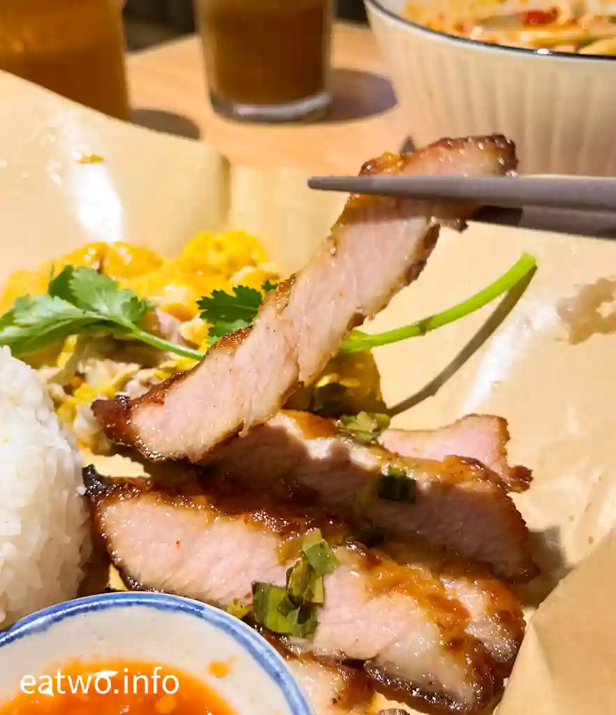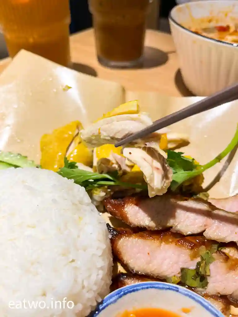 雖然當日唔少街坊都點選海南雞,感覺海南雞係店內嘅招牌作之一,但實際上海南雞就真係麻麻哋,平平凡凡,雞肉量極少,肉質一般。而雙拼飯另一選擇係豬頸肉,肉質比海南雞好少少,但唔係黏軟嘅質感,味道主要靠醬汁,配搭泰式酸辣汁係幾香,只係本身肉質缺乏香口惹味。