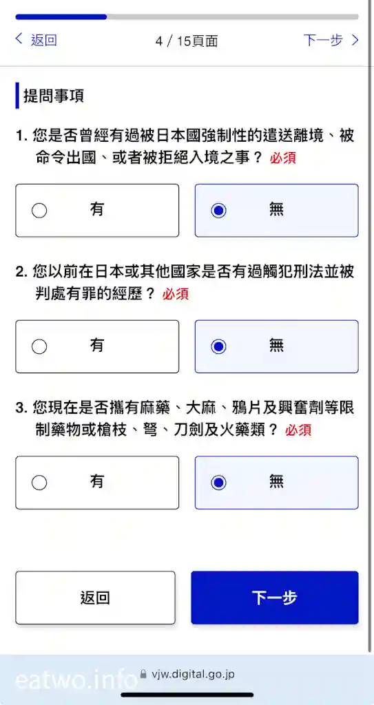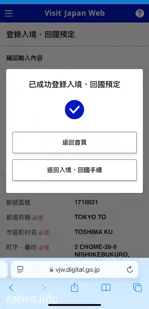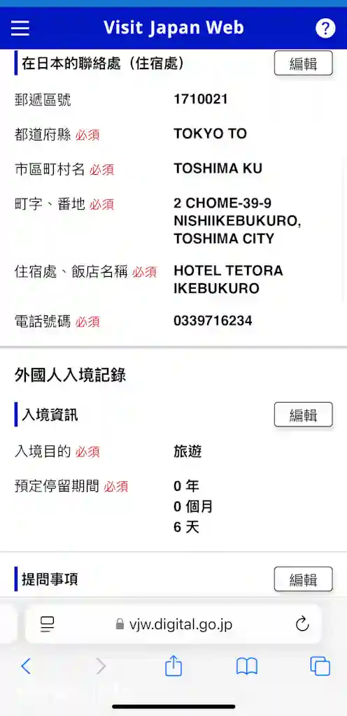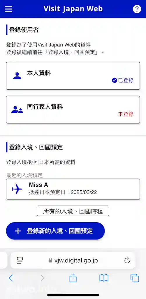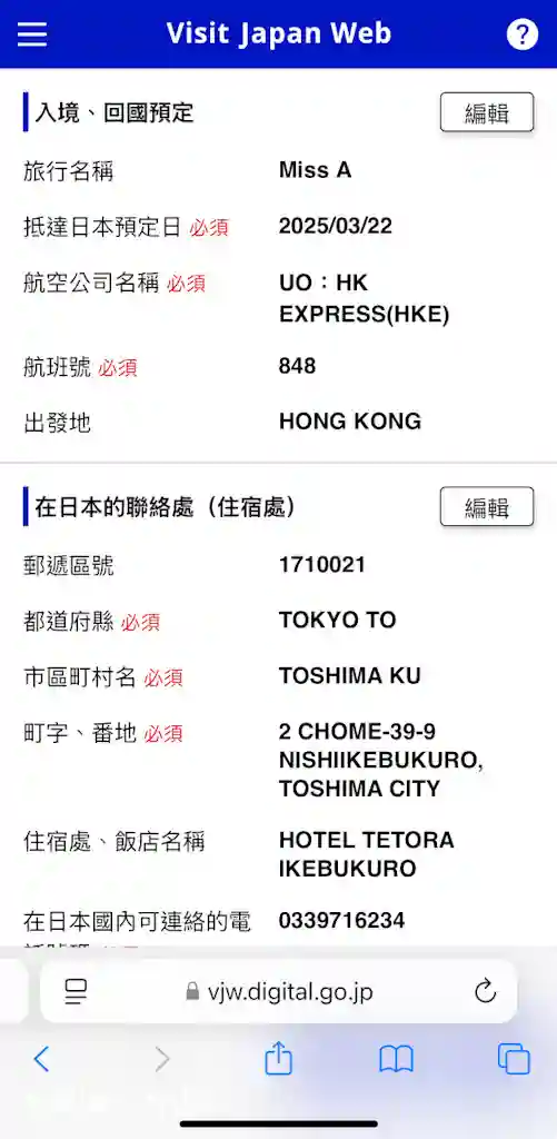 輸入完個人基本資料之後,就要填寫入境日本時嘅資料,首頁會有「登錄入境、回國預定」一欄,旅行名稱可以自訂,你鍾意填乜都得,有啲人會寫日期,但E.A.Two都係填返Mr E同Miss A個名。接下來就係填寫返抵達日本嘅日期、當日航班資料。然後,需要填寫有日本當地聯絡資料,包括第一晚入住嘅酒店名稱、地址、電話。最後確認輸入內容就得,期間可以修改編輯資料。