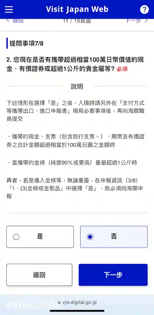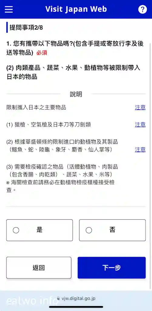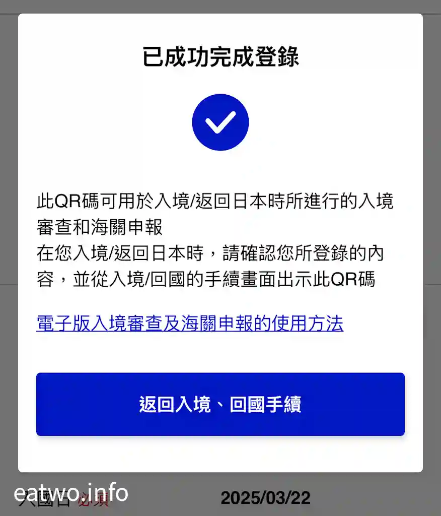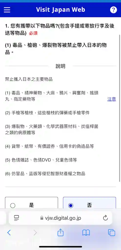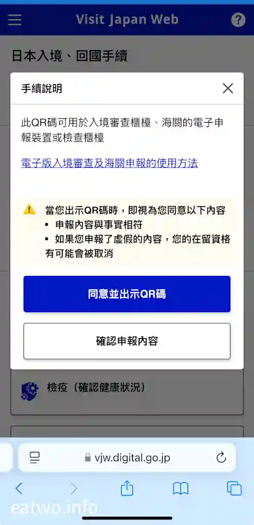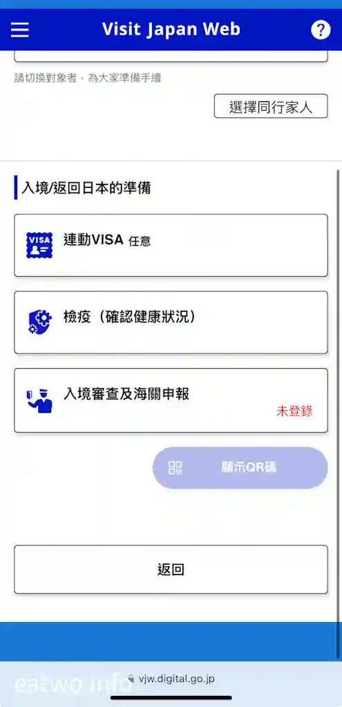 返回首頁,有一欄係「入境審查及海關申報」,呢欄同個人資料一樣係必須填寫,只係需要簡單剔返所需選項就得。完成後,系統自然會提供一個QR Code,呢個QR Code係個人入境審查及海關申報嘅QR Code,記得最後要Cap定一個畫面做Backup,到時就唔使再次用網絡繁複地登入「Visit Japan Web」搵返個QR Code。